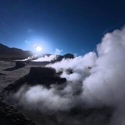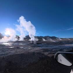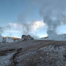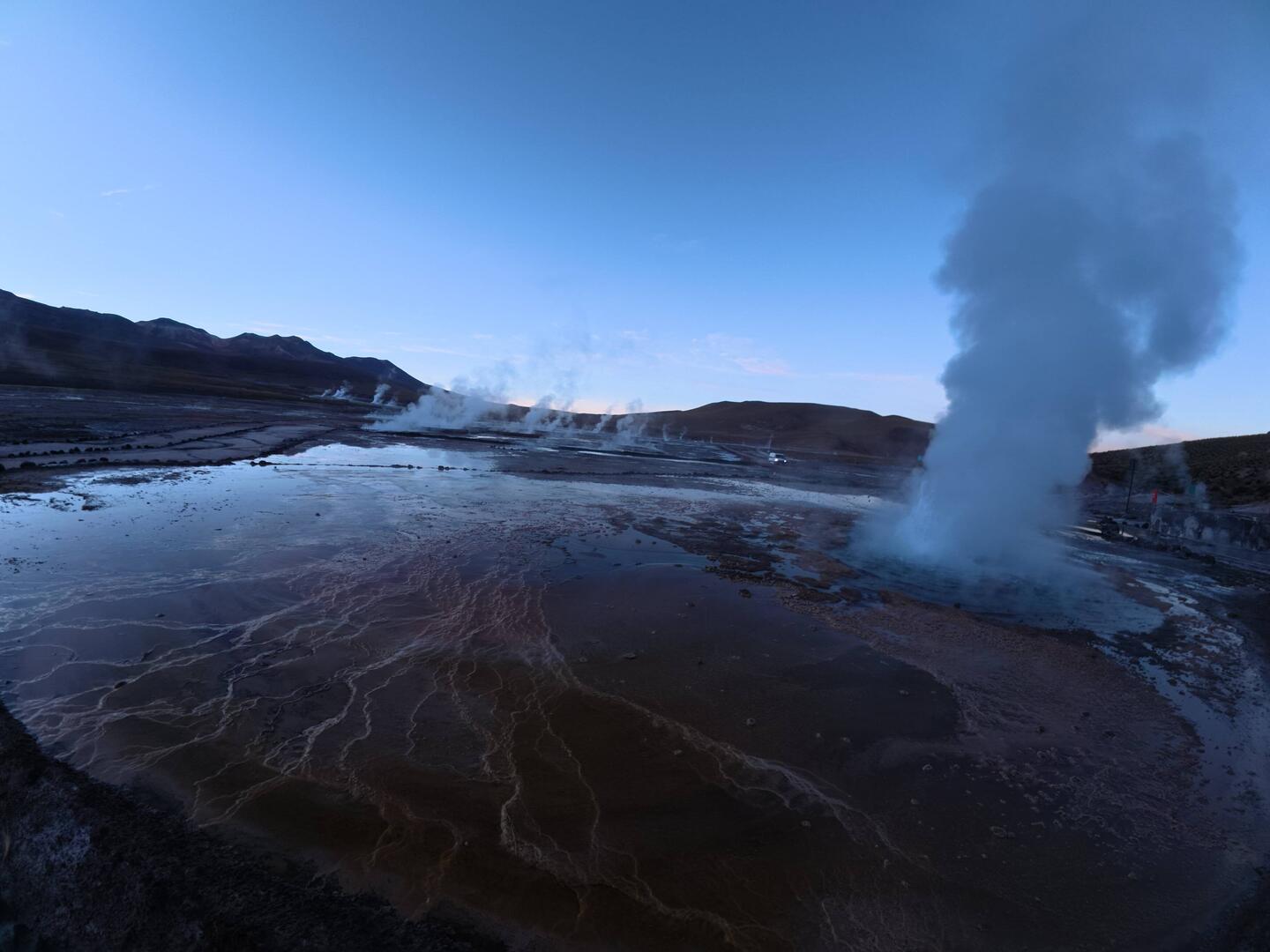 Wie schon am Vortag erwähnt klingelte der Wecker 4Uhr. Die Sachen waren schnell im Auto verstaut, noch was Kleines für den Magen und schon ging es los. In der Stadt sahen wir bereits viele Tourbusse, welche die Leute für das gleich Highlight einsammelten, wo wir hinwollten. Der El Tatio ist ein Geothermalgebiet auf 4300 Meter Höhe. Damit ist es mit circa 80 Geysiren das höchstgelegene Geysirfeld und das drittgrößte der Erde. Besonders zum Sonnenaufgang sind die zahlreichen Dampfsäulen gut sichtbar.
