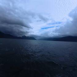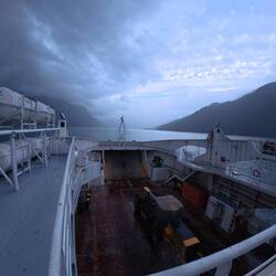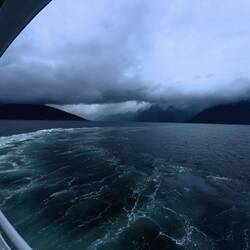 In Puerto Varas haben wir schnell unsere Basics besorgt, denn wir wollen uns weitestgehend selbst versorgen. Der Camper verfügt über einen kleinen Kühlschrank, sowie eine herausziehbare kleine Küchenzeile. Darüber ist die Liegefläche und auf dem Dach ist ein kleines Solarmodul. Ansonsten ist der Camper sehr, sehr einfach von der Ausstattung, was ich ein wenig schade finde. Fenster zum Kurbeln, das billigste Radio, wo man sich nicht mit dem Handy verbinden kann und Zentralverrieglung schließt nicht den Kofferraum. Was allerdings schön war, der erste Weg entlang am Fjord. Da verwundert es nicht, dass wir zeitnah die erste Fähre nehmen mussten. Durch den Starkregen konnten wir draußen nicht viel unternehmen, weswegen wir uns entschieden gleich die lange Fähre zu nehmen (Fahrzeit 4h) + kleine Fähre (40min), um morgen eine gute Ausgangsposition für die erste Wanderung zu haben. Immerhin die Meereswelt begrüßte uns freundlich, ein Delphin sprang beim Ablegen mehrmals aus dem Wasser. Die Natur verspricht jetzt schon einiges, auch wenn die Wolkendecke das meiste verdeckt. Dicht bewachsen tiefgrüne Hügel ragen steil ins Meer, hin und wieder sieht man Wasserfälle, welche ins hellblaue Wasser stürzen. Die Wolken werden durch den Wind über die Hügel gedrückt, dass es fast so aussehen lässt, als würde der Hügel qualmen.