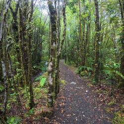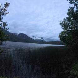 Die erste Nacht im Camper?.. war super. Nach drei nicht so langen Nächten schliefen wir aus und wir hatten beide super geschlafen. Unsere Nachbarn waren auch schon wach, ein französisches Pärchen, welche sich ihren Camper gekauft haben, aber sie wollen auch 3 Monate damit umherfahren. Ein wenig neidisch auf unser Auszugssystem waren sie aber. Wir entschieden uns für das Frühstück, während die beiden über einen kleinen Waldweg zum See gingen. Der Kaffee war mit der Bialetti schnell gekocht und wir stärkten uns mit Müsli für den Tag. Danach stand für uns ebenfalls die Seetour an. Ein kleiner schmaler Weg, kaum breiter als die Schultern führte an einem kleinen Bach entlang. Der umliegende Regenwald war so dicht, dass man nicht weit schauen konnte. Völlig bemooste Bäume und Sträucher. An einer Stelle traten im Bach Blasen nach oben, welche wir nicht verifizieren konnten. Der See selbst war sehr idyllisch. Ein schmaler Steg, führte zu einer teilweise überdachten Plattform. Das Schilf überdeckte den Uferbereich und im Hintergrund ragten stolze Berge empor, welche durch die niedrigen Wolken immer wieder verdeckt wurden. Lange konnten wir nicht verharren, denn es fing schon wieder an stärker zu regnen.
