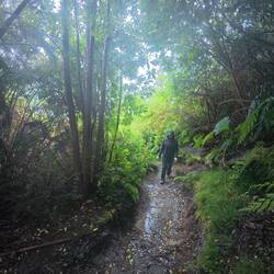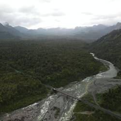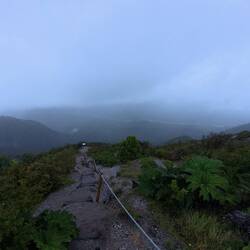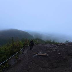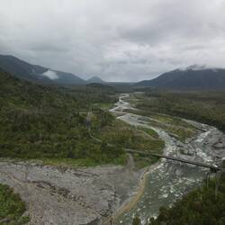 Der Vulkan Chaiten war das nächste Ziel. Ein kurzer aber steiler Weg (650Hm, 5km). Aber zunächst waren wir ziemlich unentschlossen, denn der Regen war heftiger geworden. „Hey der Regen wird weniger“ um anschließend wieder stark auf die Frontscheibe zu prasseln. In einer kleinen Regenpause schnappten wir unsere Sachen und liefen los, wohl wissend, dass es gleich wieder anfangen würde. Der Hauptteil des Weges verlief unter dem dichten Blätterdach, was nicht hieß, dass wir geschützt waren. Der Weg war über die Zeit schon sehr in Mitleidenschaft gezogen worden. Gut präparierte Holzstufen waren nicht mehr da oder weggespült. Manche Vorsprünge ging somit bis zur Hüfte und das Regenwasser floss langsam den Weg nach unten. Die Pflanzen ragten auf den so schon engen Weg und gaben ihr gesammeltes Wasser gern weiter. Wir waren schnell pitschenass, aber wollten es dennoch bis nach oben schaffen. Langsam aber stetig kamen wir schließlich oben an. Nun im freien, trieb der Wind die Kälte noch weiter in unsere Glieder. Wir standen vor dem Vulkan und konnten einen kleinen Vulkansee ringsherum erkennen, aber dieser selbst war in Wolken gekleidet. Der Ausblick ins Tal war zugezogen damit wurden wir leider nicht belohnt. Wir entschieden uns für einen schnellen Abstieg.