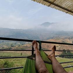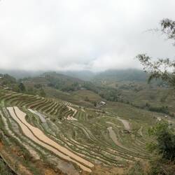 Aber jetzt, ab ins Gebirge und ins Hinterland von Vietnam. Natürlich verfuhren wir uns kurz, was aber schnell korrigiert war. Zu Beginn stießen wir auf mehrere Gruppen, welche wir aber hinter uns lassen konnten, da wir weniger interessante Dinge ausließen und die Runde andersherum fuhren. So waren wir bald alleine unterwegs. Bergauf, bergab, die asphaltierte Straße hatte gelegentlich tiefe Schlaglöcher oder der Split lag in den Kurven, manchmal war diese auch nicht mehr vorhanden und eine holprige Steinpiste ersetzte diese. Zum Glück traf letzteres nur bei circa 5% der Strecke zu. Heute sollten 100km abgespult werden, welche uns zu beeindruckenden Landschaften und wunderschönen Aussichten führten. Zwei Wasserfälle und zahlreiche Reisterrassen bestückt mit alten Gebäuden erschufen wunderschöne Kulissen. Wir waren froh, in keiner Gruppe gefahren zu sein, so waren wir unabhängig und mussten uns nicht die laute Musik geben, welche über Bluetooth Boxen während der Fahrt abgespielte wurden. Eine Aussicht hatten wir ganz für uns allein, wir bestellten einen Kaffee und genossen die Stille und das Panorama. Ehe ich die Drohne auspackte 😊