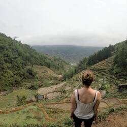 Eine lange Serpentinenstrecke führte uns ins Tal zu sehr vielen Reisterrassen. Die Stadt war allerdings bereits von den Gruppentouren in Beschlag genommen worden, sodass wir einfach weiterfuhren. Zu unserer Überraschung kamen wir auf eine neu asphaltierte Straße, wo es sich natürlich sehr angenehm fahren ließ. Ein paar Serpentinen bergauf und wir erreichten einen sehr schönen Aussichtspunkt. Motorrad abgestellt, Kaffee und Wasser bestellt und die Umgebung genossen. Ich nutzte die Möglichkeit und flog ein wenig mit der Drohne.