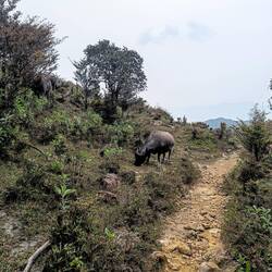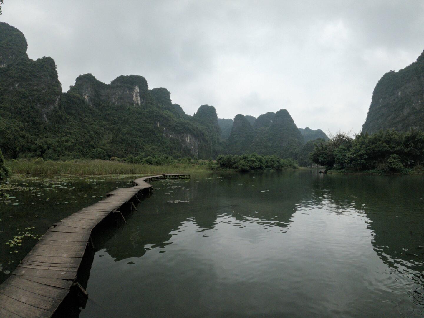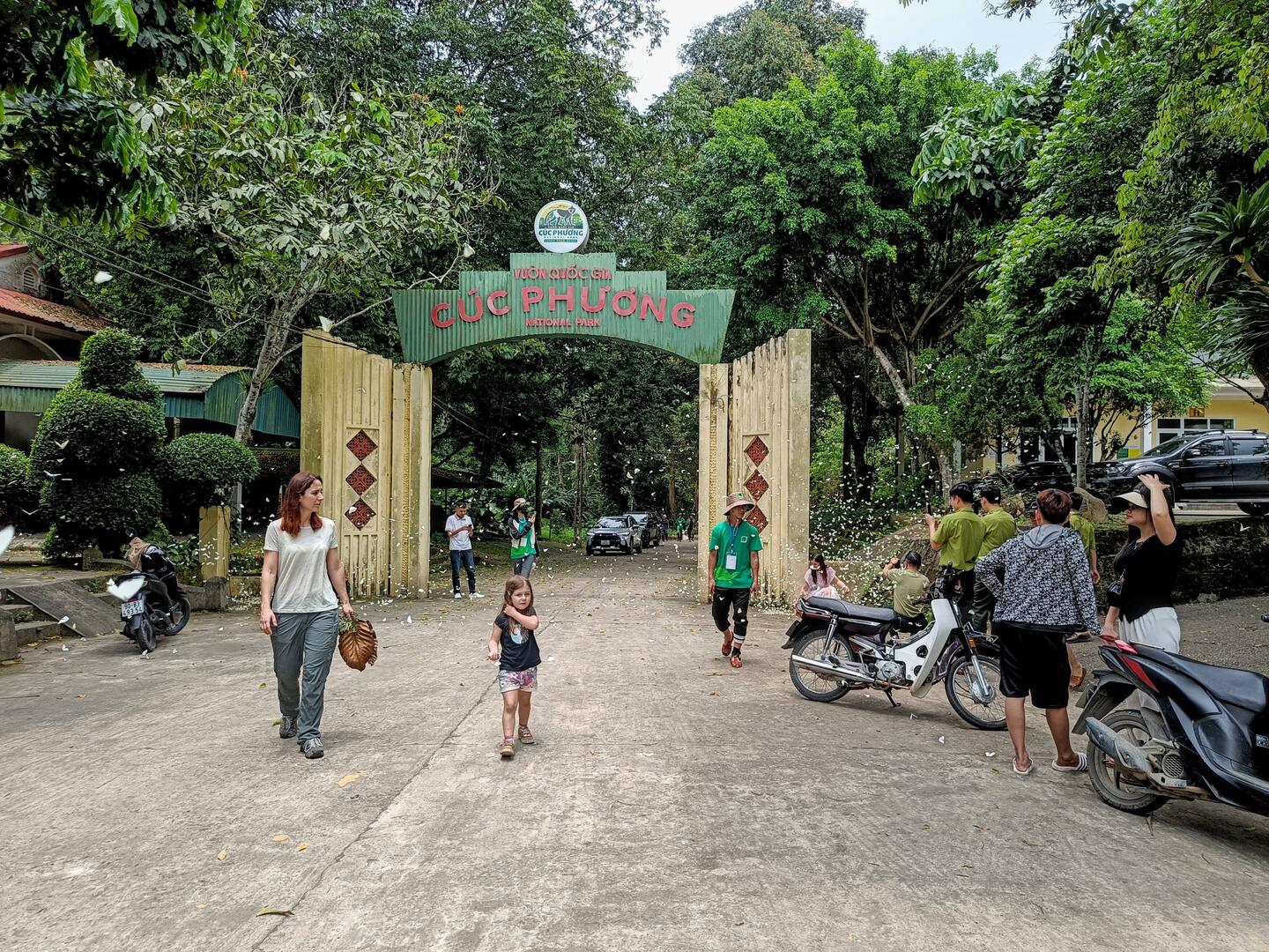 Mit dem neuen Roller ging es eine Stunde in das Hinterland, in den Cuc Phuong National Park. Das ist der größte und älteste National Park, welcher 1962 von Ho Chi Minh zum National Park erklärt wurde. Dafür ließen wir die Kalksteinformationen hinter uns und fuhren durch eine weite Ebene. Die „Straße“ war etwas erhöht, wie als würden wir auf einem alten Eisenbahndamm entlangfahren. Links und rechts wechselten die Bilder von kleineren Städten, riesigen Reisfeldern bis hin zu kleinen Tümpeln. Diese nutzten die Wasserbüffel um sich vor der Hitze zu verstecken. Es schauten nur noch die Köpfe heraus. Heute war der erste Tag mit blauem Himmel aber ein paar Wolken zogen trotzdem ab und zu vorbei. Auf dem Weg wollten wir eigentlich noch am ATM vorbei, da bei uns in der Nähe keiner so richtig war und wir morgen unsere Unterkunft bezahlen müssen. Also aufs Handy geschaut und wie sie sehen, sehen sie nichts. Restore Backup, war das erste was ich wieder lesen konnte und dachte mir bitte nicht. Wir hatten allerdings Glück, nach dem Neustart funktionierte es wieder ohne Probleme. Einmal durften wir noch Maut bezahlen, um über einen kleinen Fluss fahren zu dürfen. Es waren drei aneinander gereihte schwimmende Fundamente. Es war allerdings nicht teuer, deswegen bezahlt und weiter gings. Wir kamen nun wieder in bergisches Gebiet und unserem Ziel immer näher.