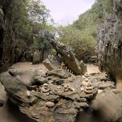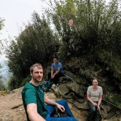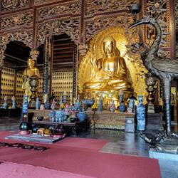 Weiter ging es zu ein paar kleineren Tempeln und Höhlen einen Kalksteinfelsen hinauf. Es sollten nur 300 Stufen sein, aber irgendwie sonderten wir heut mehr Wasser ab als sonst. Statt der gepflegten Tempelanalagen gingen die Treppen im Dschungel entlang. Lianen ragten von den Bäumen und die Palmen bzw. auch der Bambus verdichtete die Zwischenräume. Die Treppe war eine urige Steintreppe, uneben und mit verschieden großen Steinen gebaut. Als wir an der ersten Höhle ankamen, zündeten gerade drei Vietnamesen ihre Räucherstäbchen an, welche gleich die Luft mit dem Geruch füllten. In der Höhle selbst waren Opfertische aufgebaut, wo Snacks, Bier und andere Dinge dargeboten wurden. Diese wurden neben kleineren prunkvollen Buddhastatuen drapiert.