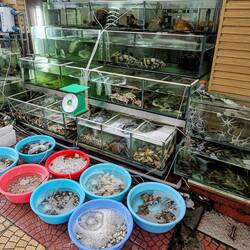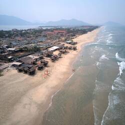 Der eckige Reifen musste wieder etwas rund gefahren werden und wie geht das besser als auf einer Passstraße. Wir waren auf dieser nicht lange unterwegs und schon eröffneten sich die ersten schönen Aussichtspunkte. Rechts ran, Motor aus und staunen. Dicht bewachsene Berge, gelb leuchtende Sandstrände, türkises Wasser und alles unbebaut. Ich wollte schon die Drohne herausholen, aber ein Vietnamese neben mir meinte, wenn du hier fliegst, ist in 5 Minuten die Polizei hier. Das Problem, hier war gleich ein US-Militärstützpunkt in der Nähe. Gut dann lass ich die lieber im Rucksack. Das Gas von Zeit zu Zeit im Anschlag kämpften wir uns nach oben, da fehlte doch ein wenig die Power. Auf unserem Weg nach oben hielten wir noch ein paar Mal. Am Gipfel hatten wir beide noch keinen Hunger, sodass wir gleich den Weg nach unten in Angriff nahmen. Auch hier eröffneten sich immer wieder schöne Blickwinkel. Unten mittendrin verlief die Eisenbahnstrecke, wie wir später bemerkten. Mal schauen, ob solche schönen Aussichten auch uns auf dem Weg nach Quy Nohn vergönnt sind. Erst zum Schluss des Passes hielten wir an einem Rastpunkt an. Dieser befand sich etwas unscheinbar am Straßenrand und hatte eine Bambuskonstruktion an den Berg gebaut, von der man aufs weite Meer schauen konnte. Zwei Kokosnüsse und zwei Kaffee später waren unser Flüssigkeitsspeicher etwas ausgefüllt, ein Drohnenflug war auch absolviert und es ging weiter nach unten. Bereits mit der Drohne hatte ich einen endloslangen breiten Sandstrand gesehen, was unser nächstes Ziel war. Wir fanden uns in einem Restaurant wieder, was etwas erhöht auf Bambusstämmen im Sand stand. Wir hatten immer noch kein Hunger, sodass es wieder Flüssignahrung gab, zwei Mango Säfte. Die waren so lecker, dass wir uns gleich noch einen und einen kleinen Snack bestellten. Wir genossen die Zeit mal nicht auf dem Roller sitzen zu müssen aber wurden stattdessen mit ein wenig Karaoke gequä…. verwöhnt. Am Nachbartisch machten die Servicekräfte gerade sauber, es ist schon krass, was bei anderen Ländern für Tischsitten normal sind. Da lagen bestimmt zehn leere Bierdosen unter dem Tisch, Verpackungsmaterial, Servietten, würde ich nie auf die Idee kommen. Auch der Wachmann von gestern am nördlichen Ende beim Checkpoint, der sitzt dort den ganzen Tag und wirft dann plötzlich seine Wasserflasche einfach in die Natur. Wir bezahlten und fanden ein paar große mit Wasser gefüllte Glasbehälter vom Restaurant. Dort bestaunten wir ein paar Fische, Muscheln, Krebse und sehr große Baumwollhummer, ehe wir unsere Schuhe auszogen und am Strand entlang spazierten. Das kühle Wasser war eine Wohltat, wobei wir mehr Baden gehen sollten. Unsere Füße haben noch dieselbe Farbe wie der Strand 😊 Begleitet wurden wir von kleineren Krabben, welche immer wieder vor uns wegrannten, ehe sie sich im Sand versteckten. Leider ergaben sich hier ähnliche Blickwinkel wie in Hoi An. Große Ferienanlagen, Resorts, die beinahe fertig aussahen, waren verweist und der Zahn der Zeit nagte an der Substanz. Hier scheinen sich etliche die Finger verbrannt oder ohne Lizenz gebaut zu haben. Am Sandstrand waren wir die einzigen, nur am Restaurant waren vielleicht neun Gäste im Wasser.
