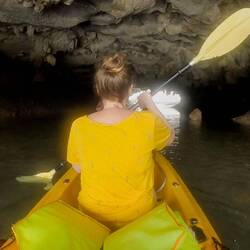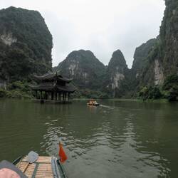 Los ging es mit dem neuen Roller (mit leuchtender Motorkontrolllampe), zu einer der Hauptattraktionen in der Umgebung von Ninh Binh. Es gibt mehrere Flusslandschaften, welche die als trockene Halong Bucht bezeichnete Landschaft, wieder in eine der Halong Bucht ähnliche Landschaft verwandelt. So starteten wir unsere Bootstour in Trang An, welches etwas ruhiger sein sollte als Tam Coc. Naja, das mit ruhiger kann ich schon vorwegnehmen, ist wohl eher Geschichte. Wir waren insgesamt zu fünft in einem kleineren metallischen Ruderboot. Vor uns ein älteres vietnamesisches Paar und hinter uns die Ruderin. Wenn wir selbst Lust hatten, lagen primitive Paddel im Boot, was nichts anderes als ein Bambusrohr mit einem flachen Holzbrett war. Die Natur war trotz des Massentourismus beindruckend. Die Kalksteinfelsen erhoben sich wieder majestätisch empor und bildeten kleinere Lagunen. Ab und zu gab es kleinere Inseln, auf dessen reich verzierte Tempel standen. Nur weil da ein Berg stand, steuerten wir trotzdem drauf zu und siehe da, eine Höhle nicht höher, als mein Kopf, welchen ich gelegentlich einziehen musste. Die Höhlen verliefen teilweise bis zu 250 Meter durch den Berg, ehe sich die nächste schöne Aussicht ergab. Nach der Bootsfahrt allerdings trübte der Massentourismus das Bild, was leider ein wenig schade war.