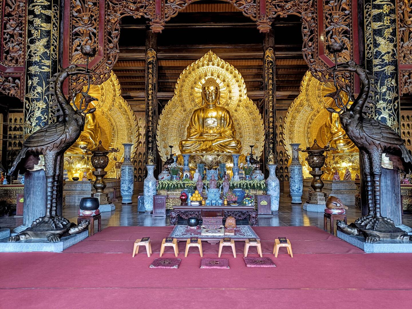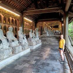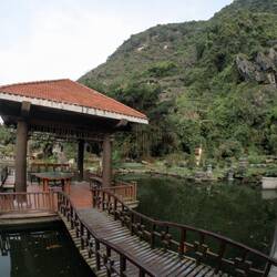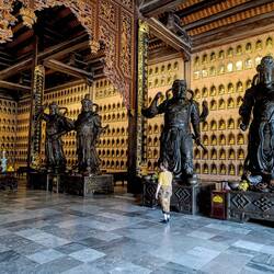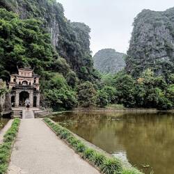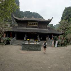 Unser letztes Ziel im Ninh Binh war eine kleine Pagode mit dem Namen Bich Dong. Die Geschichte geht bis in das Jahr 1428 zurück, der Name selbst bedeutet Green Pearl Cave. Hinein kommt man über eine kleine geschwungene Steinbrücke. Der Weg führt weiter entlang des Felsens, wo sich der erste Teil des Tempels mit einer grünen Gartenanlage befindet. Über eine teilweise in den Felsen gehauene Treppe kommt man zu einem erhöhten Tempel. Es könnte davon ausgegangen werden, dass dies das Ende des Geländes bedeutete aber da versteckte sich ein weiterer kleiner Durchgang zwischen dem Tempel und dem Berg selbst. Durch diesen hindurch, eröffnete sich eine Höhle mit ein paar weiteren Treppenstufen, welche sehr glatt waren. Nun die Höhle verlassen waren wir nun am obersten Gebiet des Tempelkomplexes angelangt. Lange verweilten wir nicht, da wir zugegebenen Maßen auch ein wenig tempelmüde wurden.