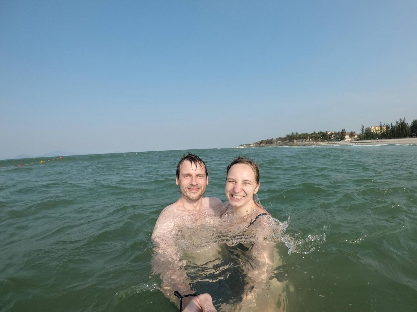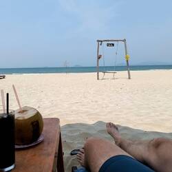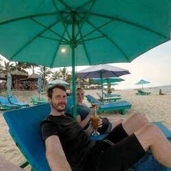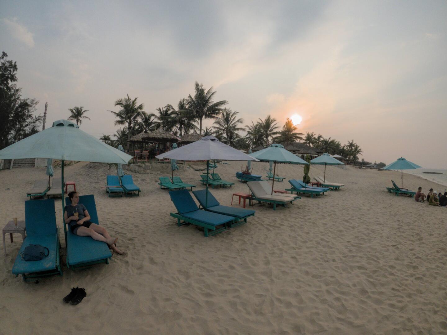 Wir fanden einen gemütlichen, kaum begangenen Strandabschnitt und bekamen vom Kiosk nebenan zwei Liegen. Dort verbrachten wir den restlichen Tag mit lesen, baden, schlafen und ein paar Getränken. Es war strahlend blauer Himmel und wir hatten zum Glück einen Schirm, welcher uns Schatten spendete. Der Strand war für vietnamesische Verhältnisse sehr sauber und das Wasser kristallklar.