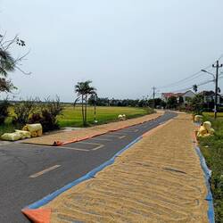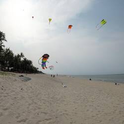 Wir hatten Glück, da wir schon eher in unser Zimmer konnten. Diesmal sehr komfortabel und hoffentlich ohne Maus, dafür eine Eidechse welche uns begrüßte. Nach einer Dusche vielen wir „kurz“ ins Bett (2h), ehe wir uns fertig machten, um die Umgebung zu erkunden. Zu Fuß, hier eher ungewöhnlich, machten wir uns auf Richtung Meer und konnten viele goldene Reisfelder um uns herum bestaunen. Schuhe aus und schon standen wir auf einem langen Sandstrand. Viele Bars, ein Volleyballnetz war gespannt aber wegen der Sonne spielte noch keiner. Drei größere Drachen schwebten an einer Schnur durch die Luft und die Wellen rauschten Richtung Strand. Für die Größe des Strandes waren sehr wenige baden oder hielten sich am Strand auf. Mit den Füßen im Wasser stapften wir in eine Richtung und mussten gelegentlich über sehr große Sandsäcke, welche gegen die Abtragung des Sandes in regelmäßigen Abständen eingebracht wurden. Schließlich kehrten wir zweimal ein, wobei die zweite Station mit dem Kokosnusskaffee am leckersten war. Deswegen gab es den zweimal 😊Neben uns lagen überdimensionierte Kokosnussschalen, der Durchmesser betrug vielleicht zwei Meter. In diesen war Fischereiequipment und ein Motor mit einer Schraube integriert. Um uns herum war offenes Meer und das Ding war einfach nur Rund und wird normalerweise mit einem kleinen Ruder benutzt. Also weit fahren die hoffentlich nicht damit raus. Eine Attraktion ist in Hoi An mit so einer Kokosnuss auf den Flussarmen umher zu gondeln. Nach der Stärkung ging es weiter entlang des Strandes an verschiedenen Objekten vorbei. Manche wunderschön gestaltet, auf dem gerade eine Hochzeit stattfand. Andere ziemlich verfallen, wo keiner mehr einen Finger rührte. Auch Bauruinen gibt es hier viele.