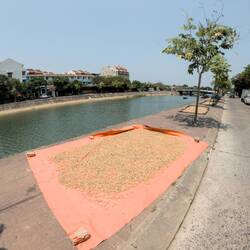 Aufgrund der Zeit entschieden wir uns irgendwann für den Rückweg, welcher uns durch ein paar schlechtere Viertel führte aber wir hatten keine Probleme. In den frühen Abendstunden konnten wir die Reisernte beobachten. Ein Traktor mähte die Halme, die Körner selbst wurden auf den Wegen ausgelegt und anschließend in Säcken verpackt. Gegen Abend wurden die Folien, mit den nicht verpackten Reis zusammengefaltet.