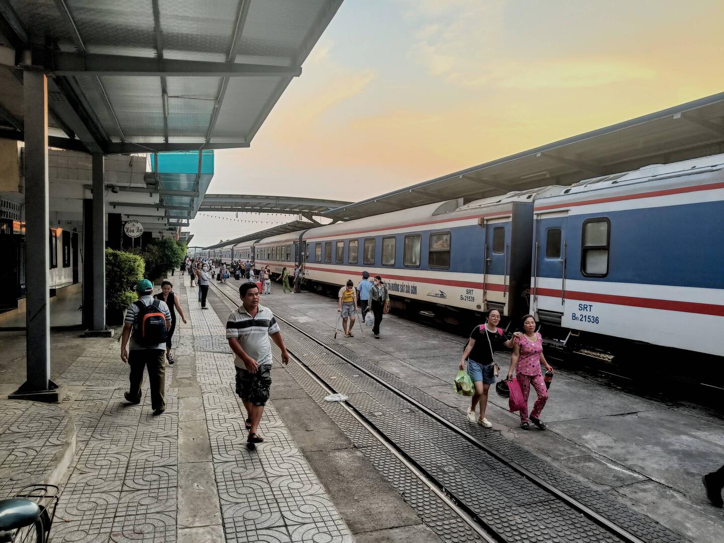 Ortswechsel und das gleich doppelt unterschiedlich als sonst. Zum einen mit dem Zug und zum anderen am Tag. Deswegen konnten wir gemütlich das letzte Frühstück in der Unterkunft essen und unsere sieben Sachen packen. Das Taxi war für 9:45Uhr bestellt, etwas später ging es nach Da Nang. Ein letztes Mal die ewig lange Straße geradeaus, aber diesmal im klimatisierten Fahrzeug. Wir hatten genügend Puffer eingeplant, sodass die Verspätung des Taxis kein Problem darstellte. Der Bahnhof war auch sehr übersichtlich. Eine Anzeigetafel, welche nicht mehr als fünf Züge anzeigte. Alle saßen im Wartebereich und die Türen würden sich erst öffnen, wenn der Zug gehalten hat. Unser Zug war der nächste. Ein wenig unsicher waren wir trotzdem wie das Ganze abläuft. Das Gefühl teilte auch ein Inder, welcher den gleichen Zug wie wir hatte. Allerdings war er nicht nur daran interessiert, sondern auch an Themen wie, wie hatten wir unsere Reise geplant, was nutzten wir, wie lange haben wir gebraucht,… und das ging weiter und weiter. Ich war letztendlich froh als der Zug kam. Wir hatten Sitzplätze für den ersten Wagon, welchen wir nach einem kurzen Fußmarsch erreichten. Langsam begann der Zug Geschwindigkeit aufzubauen und wir uns einzurichten, denn die nächsten sechs Stunden würden wir auf diesen Sitzplätzen verbringen. Der Inder war im selben Abteil und hatte immer noch Fragen. Dabei stellte sich heraus, dass er seine Reise bis ins kleinste Detail geplant hatte. Wie viele Minuten sind für den Temple zulässig, wie lange dauert der Transfer zum nächsten Ort (fahren, laufen). Ich überflog seinen Stapel an Papieren, welche er gerade bei sich hatte. Die restliche Zeit hörten wir allerdings nichts mehr von ihm. Die Zugfahrt war recht unspektakulär, Städte, Reisfelder, viele Palmen und hin und wieder überquerten wir einen Fluss. Zwischendurch wurden Essenswagen durch die Gänge geschoben. Wir wollten uns nichts einfangen, Caro hatte ein paar Magenprobleme, deswegen vermieden wir das Essen. Aber es roch sehr gut.