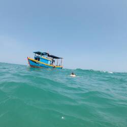 Wir liefen das kurze Stück runter zum Strand, wo genau so einen große Kokosnussschale auf uns wartete, in welcher wir vor kurzem in Hoi An gesessen haben. Die war jedoch nicht für uns, sondern nur für das Gepäck. Wir durften zum Boot schwimmen. Dafür ging es durch die Brandung, welche uns ein zwei Wellen ins Gesicht schlug. Die selbstgebastelte Holzleiter nach oben und schon waren wir auf einem kleinen Kahn. Unser Ziel war eine vorgelagerte Insel namens Monkey Island. Dort sollte es Schnorchel Spots und ein kleines Barbecue geben. Unsere Sachen, welche wir extra in das kleine Boot getan haben, waren Klatschnass, darunter auch die zwei neuen ausgeliehenen Handtücher. Da war wohl eine Welle zu groß gewesen. Die Überfahrt dauerte circa 20 Minuten, ehe wir vor der Insel vor Anker gingen. Ein kleiner Sandstrand. Wir sprangen wieder ins Meer um besagten Strand zu schwimmen, hatten jedoch unsere Schnorchel Ausrüstung angelegt. Wir erkundeten den Küstenabschnitt, aber alle Korallen waren bereits in weiß gekleidet und nicht mehr am Leben. Vereinzelt sahen wir kleinere Fischschwärme oder Seeigel. Welchen Fisch wir ebenfalls sahen, aber lieber Abstand hielten war der Feuerfisch. Außerdem überraschte uns noch ein kleiner Scharm Quallen, deren Tentakeln etwas auf der Haut brannten. Etwas ernüchtert, ging es zurück zum Strand zu den anderen Teilnehmern. Diese hatten sich bereits ein Bier geschnappt, was wir ihnen gleichtaten. Wir hatten nun zwei Stunden auf der Insel. Caro und ich spielten ein wenig Volleyball, erkundeten den felsigen Küstenabschnitt oder unterhielten uns mit den anderen. Unsere Guides grillten der Weile Gemüse-Fleisch-Spieße. Während wir diese in der Runde genossen, ließen sich vereinzelt die Affen nach und nach Blicken. Ich hätte es nicht für möglich gehalten, dass diese hier überleben können aber irgendwie scheint es zu funktionieren. Erst mit großem Abstand, zogen sie immer engerer Kreise. Die anderen Teilnehmer versuchten sich währenddessen mit dem Paddel und der großen Kokosnuss, wobei sie schnell abgetrieben wären, wenn der Guide nicht eingesprungen wäre. Die Sonne verschwand hinter einer großen Wolke und wir mussten wieder zurück zum Festland. Erst jetzt eroberten die Affen den Strand wieder für sich und tobten sich aus. Der Kahn schwankte ein wenig stärker und eine Welle warf uns eins ums andere Mal das salzige Wasser entgegen. Vor dem Strand geankert sprangen wir von der Reling ins kalte Nass und schwammen den restlichen Weg zum Strand.