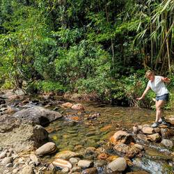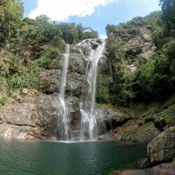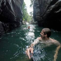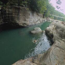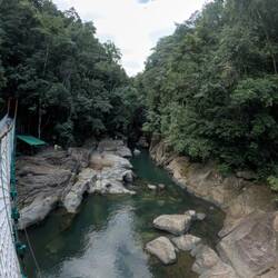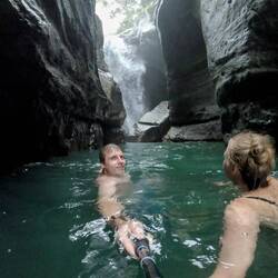 Am kleinen Parkplatz angekommen warteten bereits ein paar Einheimische. Der Eintritt war etwas übig aber dafür bekamen wir einen Guide zur Seite gestellt. Dieser war im Eintritt mit drin und musste mit. Das warum bleibt ein wenig ein Rätsel, denn der Weg war einfach zu finden. Am Eingang zeigte uns der Guide eine riesige Spinne, die wir sonst übersehen hätten. Es ging eine ganze Weile bergab und landeten letztendlich auf einer großen Hängebrücke, welche die ersten Blicke auf den Wasserfall freigab. Das Flussbett war groß aber sehr leer. Weiter oben hatte sich ein längliches Becken gebildet, welches durch die umgebenden Felsen wie eine Schlucht geformt war. Von den Steinen konnte man aus verschiedenen Höhen ins Wasser springen, was der Guide uns auch nahelegte. Außer einer anderen vierer Gruppe waren wir die einzigen. Wir erkundeten noch das umliegende Gelände, ehe wir in unsere Badesachen schlüpften. Caro kletterte rein, während ich von circa drei Metern reinsprang. Nun schwammen wir auf die kleine Schlucht zu, das entgegen strömende Wasser erschwerte das vorankommen. Stück für Stück kamen wir den herabstürzenden Wassermassen näher, bis wir uns nicht weiter trauten. Zurück ließen wir uns den größten Teil treiben. Zum Aufwärmen gab es einen Kaffee, vom Shop nebenan. Unser Guide wartete die gesamte Zeit, auch als wir den Kaffee auf den Steinen genossen. Es nieselte leicht, was uns eher weniger störte. Schließlich erlösten wir unseren Guide und traten etwas später den Rückweg an.