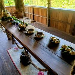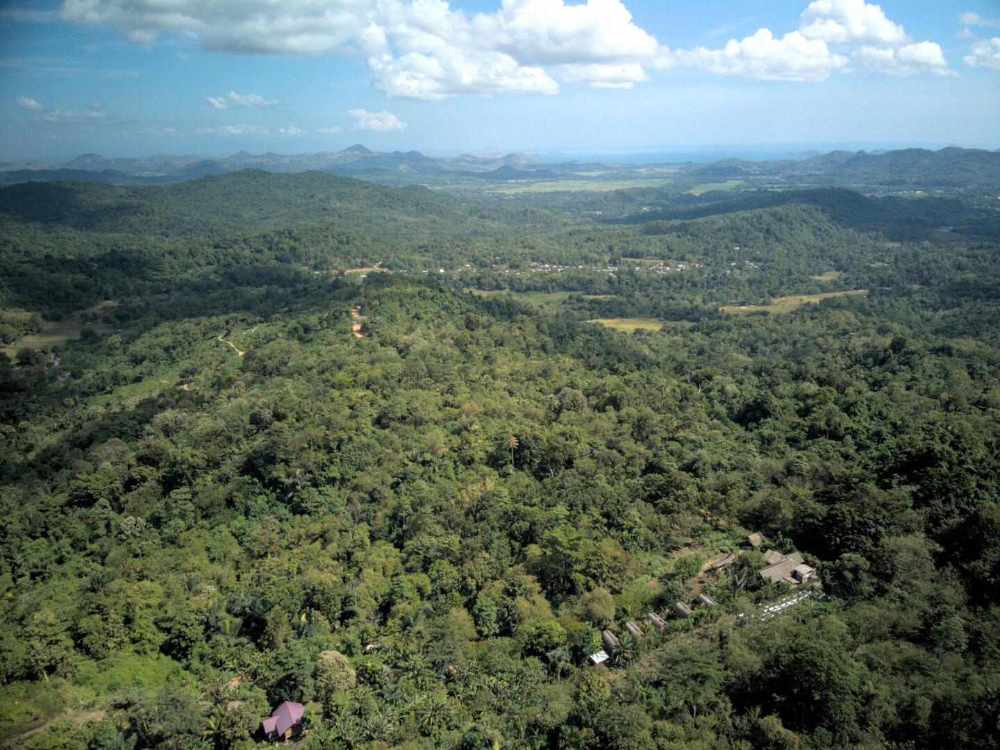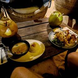 Eine kalte Dusche später waren wir hellwach, denn warmes Wasser gab es nicht. Voller Vorfreude auf das leckere Frühstück vom Vortag nahmen wir im Gemeinschaftsraum Platz. Bekommen sollten wir jedoch ein anderes. Auf dem freischwebenden Tresen war das Essen angerichtet. Es gab Hefeklöße mit Palmenzucker gefüllt, welche geschickt in Palmenblätter eingepackt waren. Dazu eine herzhafte Moringa Suppe und zwei verschiedene aromatische Tees. Durch die Hefeklöße waren unsere Mägen sehr gut gefüllt. Um das Füllegefühl etwas loszubekommen, liefen wir eine ähnliche Runde, wie am Vortag, diesmal jedoch mit Drohne.