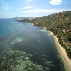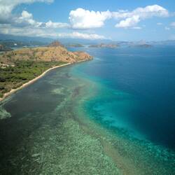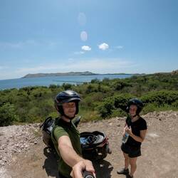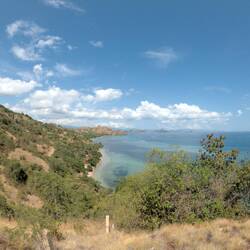 Heute schnappten wir uns wieder den Roller, denn es sollte nach Labuan Bajo und darüber hinaus auf die Landzunge gehen. Den ersten holprigen, steinigen Anstieg an der Unterkunft hatten wir geschafft, die Serpentinen bergab ließen wir ebenfalls schnell hinter uns. Ich brauchte nicht groß auf das Handy schauen, da es nur eine Hauptstraße in die Stadt gab. Statt durch die Stadt am Hafen zu fahren, kamen wir auf eine Art Umgehungsstraße, welche frisch gebaut war. So fuhren wir kleinere Hügel bergauf und -ab an der Küste entlang. Ein paar Affen durchsuchten am Straßenrand den Abfall nach etwas essbaren, etwas später schippte ein Bauarbeiter in der prallen Sonne Kies. Die gut ausgebaute Straße wechselte nun die Meeresseite. Links erschien eine schöne Bucht nach der Anderen. Mit dem türkisfarbenen flachen Wasser, den weißen Sandstränden und im Hintergrund viele kleine Inseln, bekamen wir traumhafte Aussichten geboten. Die blieben Investoren nicht verborgen, so waren zwei Großprojekt auf dieser Seite in der Bauphase. Wir fuhren immer weiter und weiter. Manche größere Landabschnitte hatten sich bereits Privatleute gesichert, da war kein herankommen an den Strand. Plötzlich hörte die Straße auf und alles was übrig war, war eine aus dem Felsen gehauene Schotterpiste. Neugierig auf das, was kommen würde, fuhren wir weiter und genossen die Landschaft. Die Straße verschlechterte sich ein wenig und es stand eine enorme Steigung an, da beschlossen wir wieder umzukehren und einen zweiten Weg etwas früher zu probieren. Auf dem Rückweg fiel uns eine schöne Bar mit Aussicht aufs Meer auf. Wir waren bereits daran vorbeigefahren, kehrten um und sollten es nicht bereuen. Die Bar war noch im Aufbau aber ein Großteil war bereits fertiggestellt. Am Hügel hatten Sie in Form von einzelnen Terrassen verschiedenste Sitzmöglichkeiten etabliert. Von einer Liegewiese, zu einem überdachten Bereich mit Tischen und Stühlen, einer Halbmuschel und ein paar Bambusgestellen. Durch den Anstieg des Hügels hatte jeder eine perfekte Aussicht auf das Meer und die dahinterliegenden Inseln. Die größte im Hintergrund hatten wir bereits besucht, das war die Insel Komodo. Total fertig von der anstrengenden Fahrt :) holten wir uns zwei Kokosnüsse, bestellten Edamame und gebackene Bananen und ließen uns im untersten Bambusgestell nieder. Ich konnte mich an der Aussicht gar nicht satt sehen, weswegen wir sicherlich fast über zwei Stunden dort verweilten und entspannten.