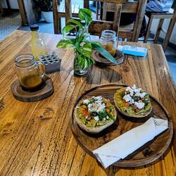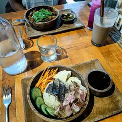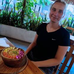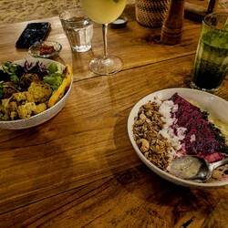 Den Nachmittag wollten wir nicht einfach verstreichen lassen, sodass wir uns für eine kleine Runde am Strand fertig machten, den Laptop und das Buch nahmen wir mit. Wir hatten letztens eine kleine Bar, etwas versteckt am Meer ausgemacht, welche wir auf einen Milchshake einen Besuch abstatteten. Zum Berichte schreiben lud die Location aber nicht wirklich ein. Einen richtigen Sonnenschutz hatten wir nicht und die Stühle waren auch nicht so. Caro hatte noch ein Restaurant im Peto, unweit entfernt. Dort gab es auch einen kleinen Laden, sowie Yogastunden, alles aufeinander abgestimmt. Das Essen war super lecker und der Shake ebenfalls. Ich hatte eine Bowl mit Reis, Gemüse und einen Thunfischsteak, während Caro eine Bowl mit Tempeh und gebratenem Gemüse hatte.