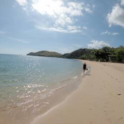 Nun wollten wir ins kühle Nass, dazu fuhren wir zu einem Strand, welchen wir noch nicht von der Liste gestrichen hatten. Der Weg, naja war wieder recht holprig und stellenweise steil. Am Strand selbst waren wir ein wenig enttäuscht. Der Strand war winzig und größere Wellen ließ ein gemütliches Baden nicht zu. Also ging es wieder auf das Motorrad und an den Strand, wo wir mit der Fähre gelandet waren, Mushroom Bay. Die Flut hatte so ziemlich ihren Höchststand erreicht, weswegen an dem doch recht großen Strand, wir aufpassen mussten, wo wir uns hinlegen. Wir konnten uns einen Schattenplatz sichern, denn den Plan hatten auch andere gehabt. Mit Blick auf den Strand und den teilweise auch großen Wellen, welche vor uns brachen, genossen wir die nächsten Stunden. Die vor Anker liegenden Boote schaukelten im Rhythmus der Wellen. Die ankommenden Fähren, welche am Strand anlandeten hatten teilweise sehr zu tun. Ein Ausflugsboot, deutlich kleiner aber mit circa 20 Leuten kämpfte sich nach vorn aufs Meer und hatten ein schlechtes Timing. Eine große Welle ließ die Bootsspitze mehrere Meter nach oben schnellen und landete zum Glück wieder richtigherum, allerdings ziemlich unsanft. Ein paar Surfer konnten wir ein wenig an derselben Stelle auch beobachten. Die Wellen liefen zwar schnell aus aber um das Aufstehen zu üben, gar nicht so schlecht. Ab und zu ging es auch für uns in die Wellen, was eine willkommene Abkühlung war.