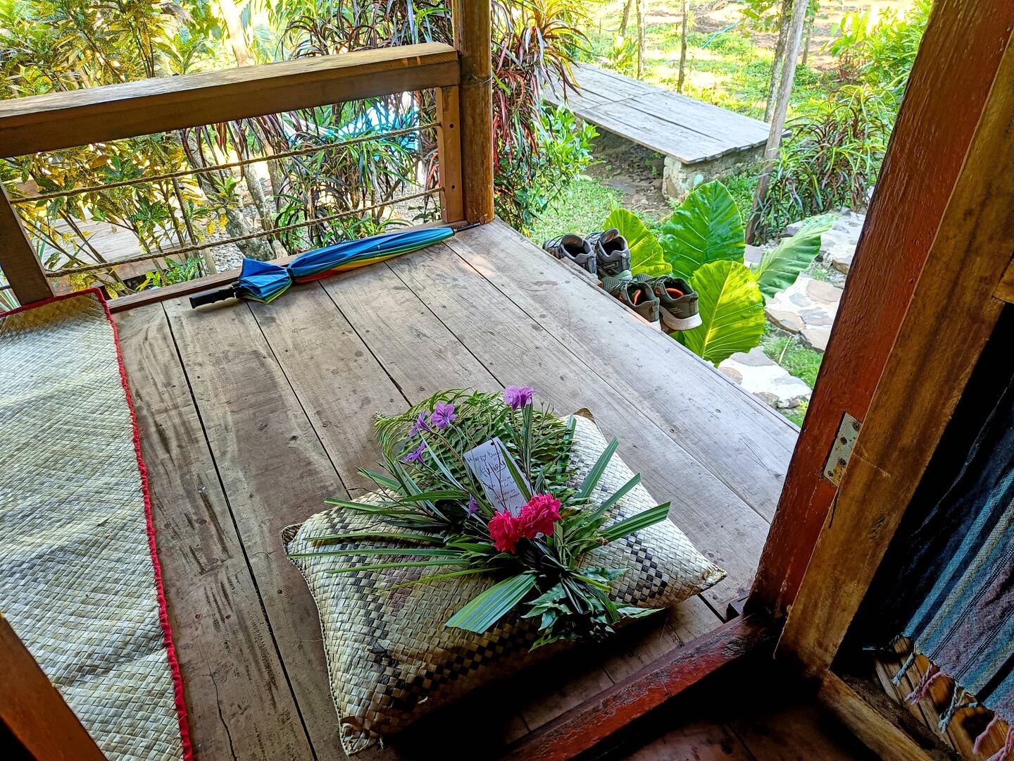 Wieder weckten uns die funkelnden Sonnenstrahlen, denn Zeitstress hatten wir keinen. Ich machte die Tür von unserer Hütte auf und da wartete die erste Überraschung auf mich. Ein schön gebundener Blumenstrauß von der Unterkunft, welcher auf einem Kissen vor der Tür lag. Eine kleine Karte, mit ein paar Geburtstagswünschen steckte ebenfalls drin. Nachdem wir uns für den Tag fertig gemacht hatten, ging es zum Frühstück. Auf dem Tresen wartete noch ein Blumenstrauß und ein wenig später auch das Frühstück. Heute gab es wieder die leckeren Pancakes, welche wir mit Freude verspeisten. Wir waren an dem Morgen nicht allein, ein Niederländer hatte am Vorabend den Weg in die Unterkunft gefunden und war vor fünf Jahren bereits in Indonesien gewesen. Jetzt verbringt er wieder eine längere Zeit hier und er zog das gleiche Fazit nach der Zeit wie ich. Teilweise erkennt man die Orte kaum wieder, weil es so touristisch geworden ist. Wo damals Felder direkt an der Straße lagen, wurden nun Restaurants gebaut. Er war gerade auf einem Motorradtrip durch Flores und blieb nur eine Nacht. Wir waren glaube ich eine der seltenen Gäste, welche länger hier verweilten. Er hatte vor fünf Jahren das Glück als einziges Boot den Komodo National Park erkunden zu können, bei uns waren es vielleicht 25.