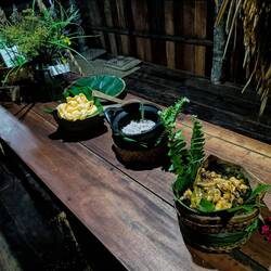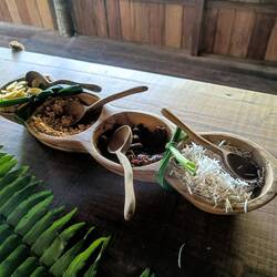 Als wir ins Bett gingen, hatten wir nur eine sehr dünne Decke zum zudecken. Skeptisch, ob wir damit gut schlafen würden. Der Dschungel macht seine Geräusche aber sonst ist es hier sehr still. Das Fliegennetz über unserem Bett hält ungebetene Gäste fern, von daher konnten wir sehr gut schlafen. Auf das inkludierte Frühstück waren wir gespannt. Wir waren wieder die Ersten und die anderen beiden erschienen wenig später. Was gab es? Pancake,s aber diesmal auf eine andere Art. Nicht zu fettig und zum selber belegen. Kokosraspeln, Bananen, gehackte Nüsse, sowie Palmzucker, alles selbst hergestellt landete auf dem Tisch. Sehr lecker. Für die beiden aus den Niederlanden hieß es heute wieder Koffer packen, so richtig hatte sich der Weg, hier raus nicht gelohnt. Wir hingegen bleiben drei weitere Nächte.