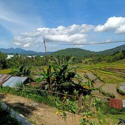 Nach dem Frühstück waren wir uns nicht ganz sicher, helfen wir vielleicht bei der Gartenarbeit oder fahren wir zu einem Wasserfall. Wir entschieden uns schließlich für den Wasserfall, wobei ich auch gern mit angepackt hätte. Hinauf düsten wir mit dem Roller. Circa eine halbe Stunde ging es auf der Hauptstraße ehe, wir auf eine Nebenstraße abbogen. Was bedeutet hier Nebenstraße, gefühlt halb so breit und von Zeit zu Zeit tiefe Schlaglöcher, sowie Sand. Wir schlängelten uns am Berg entlang und gefühlt wollte der Weg nicht enden. Der Empfang am Handy war schon längere Zeit weg, aber die offline Karte war auf dem Handy. Wir hatten erst die Einfahrt verpasst, ich hätte ja gesagt mit Absicht, denn der Weg wurde nochmals schlechter. Über eine grobe Schotterpiste quälten wir den Roller. Das Fahrwerk musste ganz schön was abkönnen. Vorbei an einer Schule, wo gerade ein Fußballspiel stattfand und uns die Kinder freudig winkten. Der Roller machte auf einmal seltsame Geräusche, welche gestern bereits bei der Heimfahrt aufgetreten sind. Ein quietschendes, schleifendes Geräusch. Gestern war es von selbst wieder verschwunden. In dem Fall stellten wir den Roller in der Natur an der Seite ab und liefen den Rest zum Wasserfall. Vorbei am Landleben im Hinterland, ging es vorbei an Reisterrassen, wo die Einheimischen die Felder vorbereiteten. Die Wasserbüffel suhlten sich im Schlamm und starrten uns verwundert hinterher. Mit der Hilfe der Einwohner kamen wir zu dem Einstieg zum Wasserfall. Ein schmaler Trampelpfad führte uns erst durch den Dschungel an einen Bach, welchen wir zweimal queren mussten. Das erste Mal lief ganz gut, das zweite Mal war etwas schwieriger. Ich hatte Flipflops an aber Caro war mit Wanderschuhen unterwegs. Trockenen Fußes erreichten wir die andere Seite und den oberen Teil des Wasserlaufes, kurz vor dem Wasserfall. Gefühlt läuft hier seit geraumer Zeit keiner mehr lang. Ein letztes Mal musste der Bach gequert werden, da es keine Trittsteine gab, nahm ich Caro kurz hoch. Das letzte Stück zum Wasserfall war durch ein Gatter versperrt. Wir ließen uns davon nicht abhalten und hatten den Wasserfall, der sehr beeindruckend vor uns erschien, ganz für uns allein. Die Badesachen hatten wir mit aber kein neuen Mückenschutz, deswegen machten wir nur eine kleine Pause. Wir blieben nicht ganz unbemerkt, wahrscheinlich eine Mitarbeiterin von dem Gelände. Wir wollten uns per Google translate verständigen, was nicht ganz so gut klappte. Die Situation war ein wenig komisch, sodass wir bald den Rückweg antraten. Der Wasserfall war sicher mit Eintritt verbunden und wir hatten per Zufall den Hintereingang gewählt.