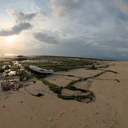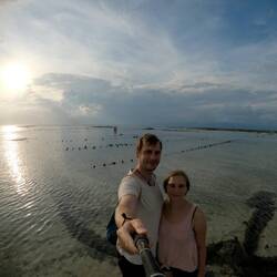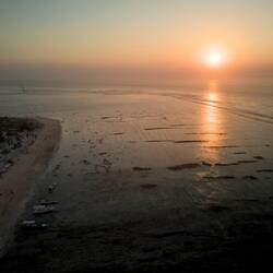 Die Zeit war fortgeschritten und eine Stunde verblieb circa zum Sonnenuntergang. Wir liefen diesmal den Strand in die andere Richtung entlang. Die Ebbe hatte die vielen Algenfarmen freigelegt und wir zogen unsere FlipFlops aus, um vielleicht den ein oder anderen Strandbewohner beobachten zu können. Viel sahen wir nicht, ein kleiner Seestern, sowie eine kleine Krabbe, welche sich zeitnah im Sand eingrub. Ansonsten stachen die Überreste der toten Korallen in unsere Füße, sodass wir wieder an den Strand zurückkehrten. Die Tourismusecke, wich den einheimischen Bereichen. Ein großes Holzboot für Ausflüge, welches teilweise auseinander genommen am Strand lag, erinnerte an eine Werft. Ein paar Arbeiter kümmerten sich in den Abendstunden um die Algenfarmen, während ihre Kinder in den zurückgebliebenen Pfützen spielten. Für den Sonnenuntergang entschieden wir uns für eine kleine Bar, wo wir die einzigen Besucher waren. Die Gopro war aufgestellt, das Bier geöffnet und die Blicke schweiften in der Ferne umher. Währenddessen liefen ein paar andere Touristen und herrenlose Hunde den Strand entlang. Vom Sonnenuntergang war leider nicht viel zu sehen, da die Wolkendecke sich nicht groß geöffnet hatte.