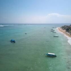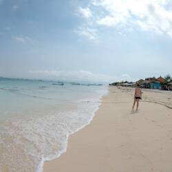 Wir hatten unsere Wäsche das letzte Mal abgegeben. Erstaunlicher Weise war hier der günstigste Preis von Indonesien, gerade mal 25.000Rp (1,40€) pro kg. Die nächste Wäsche müssen wir dann wieder selbst waschen. Anschließend schlenderten wir bei fast blauem Himmel über die Insel. Erst entlang der „Hauptstraße“, welche von den Rollern sehr befahren war, ging es über ein paar Nebenstraßen zum Meer. Immer wieder sahen wir kleinere Tempel, welche an privaten Häusern lagen. Das war wohl sowas wie der alte Stadtkern. Der Strand war ziemlich lang und sah gut aus aber war durch Fallstricke der vor Anker liegenden Boote immer wieder blockiert. Davon ließen wir uns jedoch nicht abbringen, wir mussten lediglich auf die Pausen warten, wo die Wellen das Boot zum Strand drückten und die Seile ihre Spannung verloren. Nach einer Weile in der Sonne war es Zeit für ein schattiges Plätzchen. In Verbindung mit einem Restaurant mit Meerblick ließ es sich wunderbar entspannen. In der Ferne beobachteten wir die Surfer, welche ihr Glück in den Wellen suchten. Da man dafür weiter herausfahren musste, gab es hier Surf Taxis, welche die Surfer immer wieder abholten oder wieder zurückbrachten. Die Sonne wanderte weiter, sodass wir wieder in der Sonne saßen. Um uns ein wenig im Schatten zu erholen, traten wir den Heimweg an.