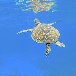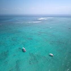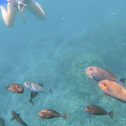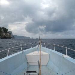 Die anderen Gäste hatten wir auf Nusa Penida abgesetzt und nun ging es zu fünft weiter. Erst fuhren wir zwischen den beiden Inseln. Die Strömung war teilweise sehr stark, was man an den Wellen beobachten konnte. Beide Inseln verfügten auf der Seite über nicht viele Strände. Nusa Ceningan war grün bewachsen bis zum Meer, Nusa Penida besaß schroffe Felsen, an den das Wasser abprallte. Das war erst der Anfang von der Steilküste, welche Nusa Penida auf der Südseite für uns bereithalten sollte. Mittlerweile hatten wir auf der eine Seite offenes Meer, und der Wellengang hatte sich verstärkt. Unsere Manta Station und Hoffnung war der Manta Bay. Hier gab es die Wahrscheinlichkeit, die Mantas zu sehen, wenn es die hier nicht geben würde, wäre der Aufschlag zum Manta Point zu zahlen. Wir fuhren kurz hinein, ein weiteres Boot war zu sehen. Nach oberflächlicher Analyse fuhren wir schließlich weiter zum Manta Point. Die Wolken waren bereits heute Morgen an der Unterkunft sehr zugezogen, wobei die Sonne stellenweise sich doch zeigte. Nun hatten wir eine dunklere Wolke vor uns, welche uns zeitweise mit einem leichten Nieselregen einkleidete. Neben uns erhob sich die Steilküste von Nusa Penida, welche sehr beindruckend war. Nur vereinzelt gab es kleine Strände zu dessen Füßen, welche nur mit ein wenig Kletterei erreichbar waren. Nach einer längeren Fahrt erreichten wir den Manta Point, welcher von anderen Gruppen immens unter Beschlag genommen wurde. Wir gesellten uns schließlich dazu und sprangen ins Wasser. Unter uns war kaum was zu sehen, als tiefes, dunkles Blau. Kleine Quallen trieben nahe der Wasseroberfläche, wo wir froh waren, dass wir unsere Wassershirts anhatten. Die Niederländer hatten da nicht so viel Glück. Zuerst hatten wir keine Relation zum Boden, erst ein paar Taucher, deren Luftblasen nach oben stiegen, ließ sich darauf schließen, dass wir doch recht weit schauen konnten. Die Wellen trieben uns der Weile wild umher. Vom Meer kommend prallten diese gegen die Steine und wurde wieder zurückgeworfen, was den Spot in einen turbulenten Wasserkessel verwandelte. Ich hatte bis dato nur einen Schatten von einem Manta in der Tiefe ausgemacht. Von nahen wurden wir erst fündig, als wir uns zu den größeren Gruppen im Wasser begaben. Wir hatten zwar keine wirkliche Bewegungsfreiheit mehr aber dafür waren zwei Mantas sehr nahe gewesen. Mit ihrer riesigen Spannweite und den großen Mund schwamm einer direkt unter mir, in circa fünf Metern Tiefe vorbei. Ich konnte mich zu der Zeit aber nur noch teilweise darauf konzentrieren, zum einen wegen den Menschenmassen, zum anderen wurde ich leicht Seekrank. Wir hatten insgesamt eine halbe Stunde an dem Spot. Wir versuchten kurze Zeit unser Glück etwas außerhalb der großen Gruppe, wurden jedoch nicht belohnt. Ich war danach wieder froh auf dem Boot zu sein. Nun ging es die gesamte Südseite zurück, auf der wir das Meer beobachten konnten, wie dieses immer wieder an die Felsen prallte. Ein paar Delphine konnten wir ebenfalls an der Wasseroberfläche ausmachen. Unser nächster Spot war Crystal Beach. Hier gab es eine kleine Korallenwelt, welche mit den Schnorchelspots auf der Komodotour nicht mithalten konnte. Durch vorgelagerte Felsen, war das Wasser ruhiger aber trotzdem ließ uns die Strömung kaum an einen Fleck verweilen. Caro entdeckte schließlich eine Schildkröte zwischen den Korallen. Die hatte uns auch entdeckt und wartete, bis wir das Interesse verlieren. Den Gefallen taten wir ihr nicht. Also ging das Ganze in ein Wartespiel über, mit dem besseren Ende für uns. Die Schildkröte musste wieder Luft schnappen und kam zu uns an die Wasseroberfläche. Mir war immer noch sehr unwohl, sodass ich etwas von meinem Frühstück wieder herausbrachte. Das wiederrum erfreute die Fische, welche nun von allen Ecken kamen. Caro konnte das Spektakel beobachten. Mir ging es danach ein wenig besser. Der letzte Schnorchelspot lag kurz vor der Anlegestelle. Hier sah die Korallenwelt wieder deutlich besser aus und die Fischanzahl war auch deutlich größer. Wir bekamen von der Besatzung ein wenig Brot zugeworfen, welches wir auf unsere Tour mitnahmen. Immer wieder zerbröselten wir kleinere Teile, was kleine Fischschwärme anlockte. Einer war so gierig und wusste, dass ich noch was in der Hand hatte und biss in meine Hand. Nachher konnte man vier Bissspuren sehen, zwei Zähne oben und zwei unten. Das Spiel wiederholten wir, bis unser Brotvorrat alle war. Die anderen waren bereits zum Boot zurückgekehrt, was wir dann ebenfalls taten.