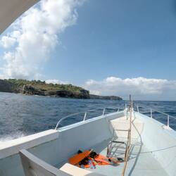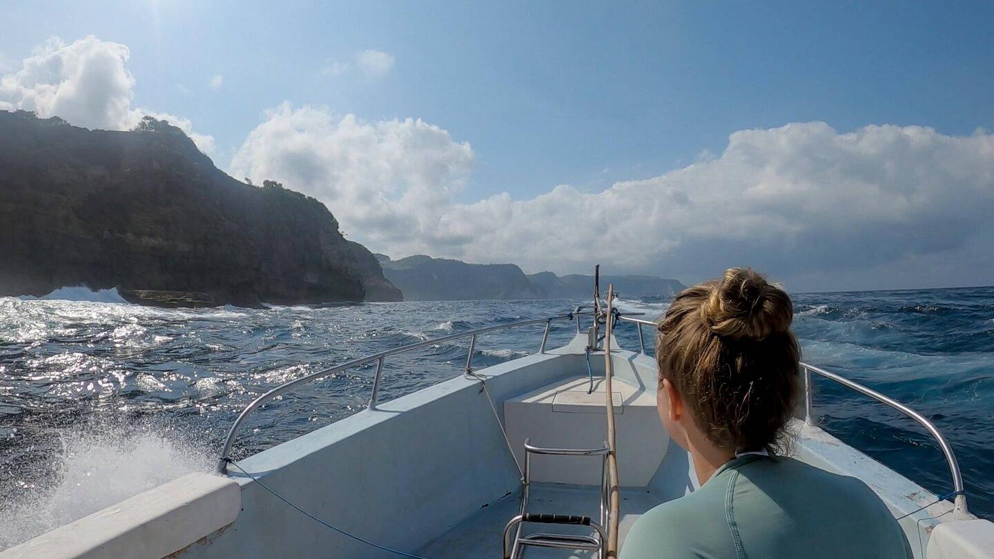 Früh weckte uns der Wecker, wobei wir uns langsam wieder an die Zeit gewöhnen können (müssen). Wir hätte jedoch noch eine halbe Stunde weiterschlafen können, da wir uns bei der Abfahrt der Fähre um eine halbe Stunde vertan hatten. So konnten wir gemütlich unseren Kaffee genießen und entspannt zum Abfahrtspunkt der Fähre fahren. Den kannten wir vom Vortag und dieser war bei der gelben Hängebrücke. Wir nahmen absichtlich einen anderen Weg über die Insel und fuhren über das „Hinterland“. Teilweise etwas holprig, mit mehreren Schlaglöchern, wobei die noch harmlos waren, zu den was wir noch erleben würden. Mit einem kleinen Schnellboot ging es rasch auf die Insel Nusa Penida. Wir saßen auf der linken Seite, auf der richtigen, denn der Mann gegenüber bekam eine volle Welle ab. Ein Motorroller sollte auch mit übergesetzt werden, welcher in der Mitte des Bootes hin und her schwankte aber zum Glück stehen blieb.