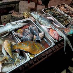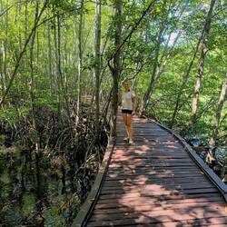 Vom Wasser hatten wir direkt neben dem Einstiegspunkt ein Restaurant am Flussarm gesehen, was wir danach aufsuchten. Bei einem Getränk auf dem Steg konnten wir große Fische im Wasser beobachten, welche vom Restaurant aufgezogen wurden. Was wir ebenfalls vom Wasser gesehen hatten, war ein Holzsteg, welcher am Ufer entlangführte. Die Mangrovenbäume waren geschickt integriert aber auch hier suchte man die Tierwelt vergebens. Der Weg selbst war relativ kurz und wir nach zehn Minuten zurück. Es war Mittagszeit und die Sonne drückte mit ihrer Kraft von oben, sodass wir uns für eine kleine Pause in unserer Hütte entschieden.