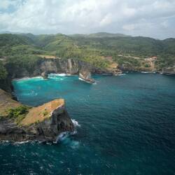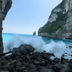 Das letzte Ziel war der Tembeling Beach and Forest. Ein kleiner süßer Strand mit einem Süßwasserbecken. Unsere Hoffnung, dass dieser Ort weniger begangen war, ging auf, sodass wir schnell den Einstiegspunkt erreichten. Wir wurden kurz gestoppt und darauf aufmerksam gemacht, dass der Weg darunter mit dem Roller schwierig zu bewältigen ist. Ziemlich schmal, steil und mit vielen Schlaglöchern. Als nächstes bot er uns an, uns mit dem Roller herunterzufahren. Ich wollte es aber erstmal selbst probieren und notfalls konnte wir den Roller an der Seite abstellen und den Rest zu Fuß zurücklegen. Der Weg, Pfad war wirklich recht schmal und nicht mal einen Meter breit. Dazu kamen wirklich steile und auch nasse Stellen und die Beschaffenheit war eher holprig, steinig. Caro musste hinter mir ein paar Mal tief durchatmen aber wir kamen heil herunter. Auch mir war an manchen Stellen, jedenfalls mit dem Roller, ein wenig unwohl. Den Rest konnten wir über mehrere Treppen nach unten laufen. Hindurch ging es durch dichtbewachsene Bereiche, die Lianen ragten von den Bäumen und über uns ragten die ersten Felskanten in die Höhe. Ein paar größere Felsbrocken mit heller Bruchfläche zeugten von einem nicht allzu vergangenen Abbruch. Ein kleiner Naturpool mit einem kleinen Tempel lag auf halber Strecke. Wir gingen jedoch weiter, da wir zum Strand wollten. Durch die Bäume konnte man nun schon das türkise Wasser sehen, das Rauschen der Brandung hatte uns schon länger begleitet. Statt zum Strand zu gehen, machten wir einen kleinen Abstecher durch eine Höhle und gelangten zur nächsten Bucht. Senkrecht ragten die Felsen über unseren Köpfen nach oben, während wir unten, leicht erhöht, auf die Wellen und das Meer schauten. Der Ort war wirklich wenig begangen, so suchten wir uns einen Platz und ließen die Szenerie auf uns wirken. In fünf Minuten waren wir dann beim Süßwasserpool und dem Strand selbst. Der Strand war sehr klein und lud keinesfalls zum Baden ein. Zu groß waren die Wellen und mit Sicherheit auch die Strömung. Stattdessen ging es in den Süßwasserpool, welcher zwar künstlich angelegt wurde aber sich sehr gut in die Umgebung einfügte. Herrlich erfrischend und genau der richtige Zeitpunkt für eine Auszeit von der Sonne. In der Umgebung des Pools waren viele kleine Krabben unterwegs, welche ein wenig anderes als die herkömmlichen Krabben aussahen. Wir versuchten kurz unsere nächsten Schritte zu planen, denn um 16 Uhr ging bereits unsere Fähre zurück nach Nusa Lembongan, die letzte nur eine halbe Stunde später. Eine Netzabdeckung gab es an der Steilküste nicht, sodass wir die Planung nach oben verschieben mussten. Einen weiteren Punkt hatten wir auf der Liste und das war der Manta Point, welchen wir bereits mit der Schnorcheltour besucht hatten. Diesmal wollten wir den von oben sehen und vielleicht mit der Drohne ein paar Mantas von oben sehen. Dazu ging es den harschen Weg sukzessive nach oben. Der Roller musste ganz schön leiden und als Vermietungsfirma würde ich so manches Ziel ausschließen.