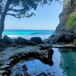 Der Roller war im Schatten abgestellt und wir zu Angels Billabong unterwegs. Das war eine Gesteinsformation an der Steilküste. Interessante Muster hatte das Wasser über Jahre in den Stein gezaubert, wobei das nicht das Highlight war. Das war ein „Graben“ bzw. längliches Wasserbecken in der Steilküste. Nicht besonders tief wirkte es wie ein Infinity Pool, aber ein gefährlicher. Immer mal wieder spülte eine größere Welle über die Kante, welche beim Abfließen jeden mitgerissen hätte. Im anderen Moment hatte sich wieder alles beruhigt und sah friedlich aus. Der Ort war schon ziemlich von Touristen überlaufen, sodass wir zeitnah zu Fuß zum Broken Beach aufbrachen. Der war zwar nicht weniger überrannt aber ziemlich Eindrucksvoll. Auch hier hatte sich das Meerwasser an der Steilküste zu schaffen gemacht. Ein gigantisch großes Loch klaffte nahe der Steilküste. Innendrinnen brachen die Wellen, der einzige Meereszugang war ein größeres Loch zur Meeresseite. Wir konnten einmal drumherum laufen und jeden Winkel anschauen. Auf der einen Seite gab es eine „Absperrung“, man würde sagen, sie waren stets bemüht. Mehrere kleine Holzpfeiler, vielleicht 30cm lang, ragten aus dem Boden und waren durch einen Strick miteinander verbunden. Vielleicht dienten sie eher als Stolperfalle, an manchen Stellen waren die Holzpfeiler bereits rausgezogen. An der Steilküste selbst gab es keine Absicherung und man konnte ohne Probleme zur vorderen Kante gehen. Eine Schildkröte konnten wir von oben erkennen, bevor wir ein schattiges Fleckchen aufsuchten. Mit Blick auf Angels Billabong genossen wir eine große Kokosnuss. Einen Löffel für das Fruchtfleisch gab es dazu aber es war zu viel. In der Zeit beobachteten wir die Menschenmassen, wie sie sich für die besten Fotospots anstellten und posierten.