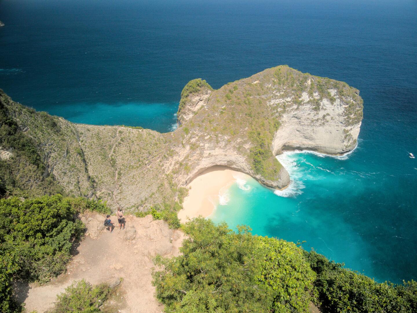 Lediglich eine halbe Stunde Fahrtweg entfernt lag das nächste Ziel, wodurch die Insel berühmt geworden war. Der Kelinking Beach, ein wunderschöner Sandstrand, in Zusammenhang mit einer vorgelagerten Landzunge, welche ein beindruckendes Landschaftsbild ergaben. Zuerst mussten wir jedoch dahin kommen. Das erste Stück war recht flüssig, was man von letzten Stück nicht sagen konnte. Manche Tagestouristen wie wir, nehmen einen Roller oder ließen sich von einem Rollerfahrer mitnehmen. Es gibt auch einige, welche eine Tour buchen und mit dem Auto herumgefahren wurden. In Verbindung mit engen und schlechten Straßen ging es zeitweise recht zähflüssig vorwärts. Das schlechte dabei, durch die Autokolonne, kamen manche tiefe Schlaglöcher sehr überraschend. Wir waren schließlich froh den Roller abstellen zu können und folgten den nächsten Menschenströmen in Richtung Steilküste. Und plötzlich zeigte sie sich und war sehr schön anzuschauen. Für ein besseren Blickwinkel bogen wir nach rechts ab und liefen ein kleines Stück an der Steilküste entlang. Es zeigten sich ein paar ungewöhnliche Bilder. Ein Tourist teilte seine Erdnüsse mit ein paar kleineren Affen, wobei sich andere aus dem Müll bedienten. Die Affen schienen aber friedlicher zu sein. Entlang der Klippe gab es Lücken mit freier Sicht auf den Strand. Hier verwandelten sich die Fahrer oder Tourguides in Fotografen und teilweise in Affen. Für die beste Perspektive kletterten sie auf kleinere Bäume und fotografierten ihre Gäste von oben. Wir ließen die Spots hinter uns und fanden einen ruhigen Bereich. Wir standen nahe der Klippe und konnten die großen Wellen beobachten, wie sie immer wieder am Strand ausliefen. Es war auch möglich zu dem Strand zu gelangen, hierfür musste man einen steilen Weg auf der Landzunge nach unten folgen. Die Touristen, welche die Strapazen auf sich nahmen, sahen aus wie kleine Ameisen. Wir hatten noch andere Ziele auf der Liste, welche wir sonst nicht mehr geschafft hätten, weswegen wir uns zeitnah wieder auf den Roller schwangen.