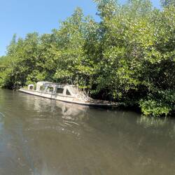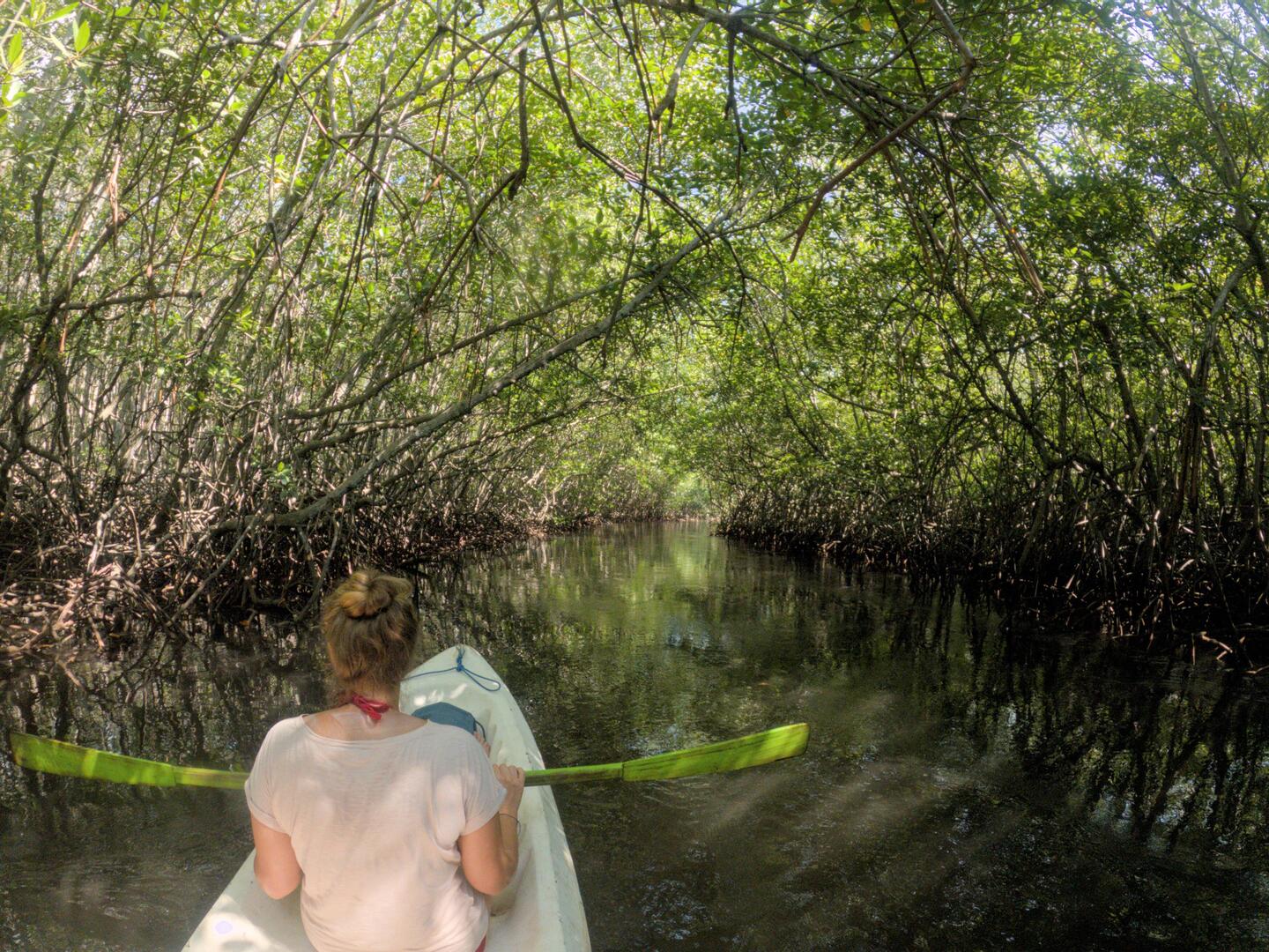 Ich wachte ein wenig früher auf und setzte mich mit dem Laptop auf dem Balkon. Ein paar Vögel zwitscherten, das Eichhörnchen sprang von Palme zu Palme und unseren Pool, sowie unser kleines Grundstück wurde gepflegt. Etwas später gesellte sich auch Caro dazu und somit starteten wir gemeinsam in den Tag. Eine Aktivität wollten wir neben dem Baden noch unternehmen und das war den Mangrovenwald auf der Insel zu erkunden. Dazu fuhren wir mit dem Roller erst an der Küste entlang und suchten uns ein Seekajakverleih. Einen zu finden war nicht das Problem, wie sich herausstellen sollte, war es eher die Qualität der Ausrüstung. Der Roller war abgestellt, der Preis verhandelt, da liefen wir zum Einstieg. Ein altes Seekajak, schon sichtlich in die Jahre gekommen, dazu gab es ein sehr einfaches Holzpaddel und ein halbwegs brauchbares Paddel. Wir starteten unsere Tour und waren sofort im Mangrovengebiet. Die Flut hatte begonnen und das Wasser strömte in die Flussarme, sodass wir auf der Hintour kaum aktiv werden mussten. Die Mangroven waren ziemlich dicht, ein weiter Blick eher schwierig. Die Wurzeln ragten durch die erst beginnende Flut weit aus dem Wasser. Wir hielten auch nach der Tierwelt Ausschau aber außer vereinzelt knackenden Geräuschen hörten und sahen wir nichts. Die Breite des Flussarmes nahm immer mehr ab und das Blätterdach schloss sich über uns. Mittlerweile hingen die Ableger von den Bäumen herunter, welche wir mit den Armen zur Seite schieben musste. Einfach umdrehen war ab einem gewissen Punkt nicht mehr möglich, da das Wurzelwerg auf beiden Seiten keinen Platz mehr ließ. Mit den Paddeln schoben wir uns an den Wurzeln nach vorn. Da es eher mühsam wurde, nutzten wir eine Lücke im Wurzelwerg und konnten so mit der Bootsspitze hineinstechen, während das Heck geradeso hinten herum passte. Die Drehung hatten wir geschafft, nun ging es denselben Weg gegen die Strömung zurück. Das Blätterdach öffnete sich über uns wieder und wir nahmen einen weiteren Flussarm unter die Lupe. Eine kleinere Fähre lag halbversunken am Ufer und hatte bereits über die Jahre sehr gelitten. Auch den Flussarm fuhren wir fast bis zum Schluss. Das Gebiet war nicht groß und die Anstrengung hielt sich in Grenzen, wobei es mit besserer Ausrüstung mehr Spaß gemacht hätte. Somit gaben wir das Boot nach circa einer Stunde wieder ab.