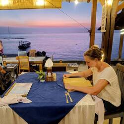 Wir hatten noch eine Stunde bis Sonnenuntergang, sodass wir mit dem Roller schnell nach Hause düsten, denn den letzten auf der Insel wollten wir vom Strand aus sehen. Ziel war die kleine Bar, welche kaum besucht wurde und an der wir bereits einen Sonnenuntergang gesehen hatten. Wir waren rechtzeitig da aber es hatte sich mittlerweile ein leichter Nebel über das Meer gelegt. Da es nicht, wie beim letzten Mal, Wolkenverhangen war, sahen wir zumindest schon mal mehr. Zum Abendbrot suchten wir dasselbe Lokal auf, wo wir gestern zum Abschluss saßen. Recht vornehm waren wir erst verunsichert, ob wir wirklich da essen wollten. Wir setzten uns hin, bekamen die Stoffservietten auf den Schoß gelegt und bekamen die Karten. Eine große Auswahl an Speisen zu doch erschwinglichen Preisen. So ließen wir uns den letzten Abend es gut gehen. Vorspeise, Hauptspeise und Dessert landeten nach und nach in unsere Mägen, während der Himmel über dem Meer sich von hellblau eher dunkleren Farbtönen zuwendete.Read more