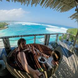 Weiter ging es zu Devils Tears und dem Dream Beach. Beides lag unmittelbar nebeneinander. Devils Tears kann man sich ebenfalls als eine kleine Bucht von Felsen vorstellen, wo sich das Wasser seit Jahrzehnten reingefressen hat. Das Wasser hat den Felsen mittlerweile unterhöhlt. Kommt eine Welle, wird die eingeschlossene Luft verdichtet. Sobald die Welle abflacht, kommt eine Wasser Fontaine herausgeschossen. Als wir an den Felsen ankamen, war gerade reges Treiben. Eine japanische Reisegruppe von bestimmt 30 Leuten belagerte den Ort und machten mehrere Fotoshootings, erst mit der Drohne, später einzeln. Wir nahmen erstmal Abstand und beobachtete danach in Ruhe. Als wir von der anderen Seite schauten, merkten wir, dass durch die Sonne ein kleiner Regenbogen in die Wasser Fontaine gezaubert wurde. Wir waren bereits eine Weile in der Sonne unterwegs, sodass wir uns dazu entschieden am Dream Beach eine kleine Pause zu machen. Auf einem runden Strandkorb mit Liegefläche machten wir es uns bequem. Neben der wunderschönen Aussicht versüßten wir uns den Anblick mit einer Smoothie Bowl. Wir verweilten eine ganze Weile, ehe es zur letzten Station gehen sollte.
