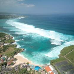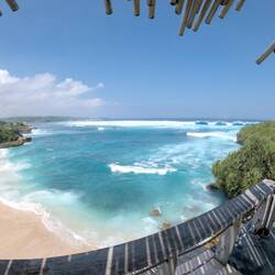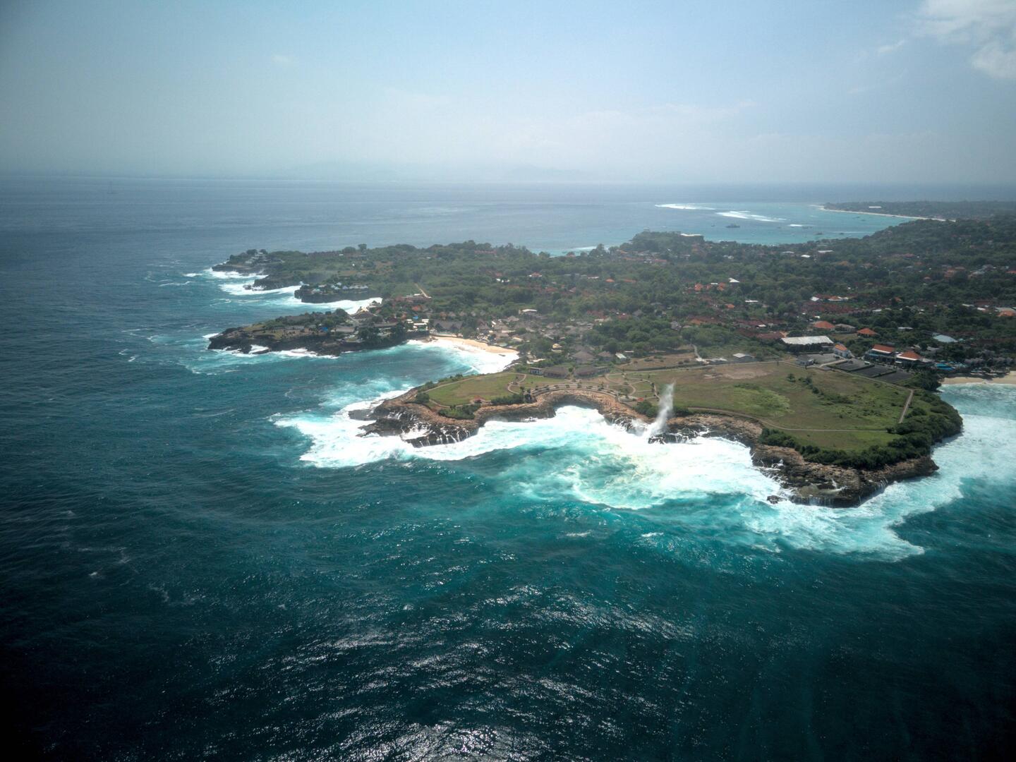 Das Frühstück lag bereits hinter uns und wir schnappten uns den Roller. Ich wollte von drei verschiedenen Positionen mit der Drohne in die Luft steigen. Zuerst am nördlichen Ende, dann an dem langen Strand vor der Haustür und zum Schluss quer über die Insel, auf die westliche Seite zum Dream Beach. Der erste Spot war schnell erledigt. Beim zweiten wollte Caro unbedingt einen Kuchen in einem Restaurant probieren, was wir gleich kombinierten. Aus einem Kuchen wurden für jeden eins und ein Glas Jamu. Im Hintergrund konnten wir wieder die Surfer beobachten, welche heute mit größeren Wellen zu kämpfen hatten. Der dritte Spot ersetzte uns abermals in Erstaunen. Das letzte Mal als wir hier waren, war gerade Ebbe und die Wellen eher gering. Nun waren wir fast beim Höhepunkt der Flut und die Wellen waren heute gefüllt eh schon größer, aber die Wellenfront, die wir vor uns hatten, waren gewaltig. Wir sicherten uns im Restaurant in der zweiten Etage einen guten Platz und beobachteten die Szenerie ausgiebig. Unten am Strand trauten sich nur vereinzelt Leute ins Wasser. Mit der Drohne nahm ich auch Devils Tears ins Objektiv. Die Wellen schlugen mit voller Kraft gegen die Felsen, was große Wasserfontaine zur Folge hatte. Mit infused Water und einem Schokoladendessert genossen wir den Moment und ließen unsere Gedanken in die Ferne schweifen.