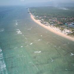 Erst warteten wir ein wenig im Büro der Fährfirma, anschließend im Hafenterminal. Wir hatten eine schnellere Fähre bekommen, welche uns in etwas mehr als 30 Minuten nach Nusa Lembongan bringen sollte. Die Sitzreihen waren wieder verdammt eng gewesen. Während der Überfahrt fuhren wir an Balis Küste vorbei. Leider standen die Wolken zu tief, um die beiden Vulkane sehen zu können. Beim Einstieg in die Fähre ging es über den Steg, beim Ausstieg über den Strand. Leider waren es bis zur Unterkunft statt der berechneten halben Stunde nun eine Stunde Fußmarsch. Die Fähre hatte leider in einer anderen Bucht gehalten, als wir gedacht hatten. Unter der Sonne und teilweise wechselndes Gefälle, hatten wir ziemlich schnell Schweißtropfen auf der Stirn. Ein Taxi hatten wir wegen des überhöhten Preises abgelehnt. Nach einem Drittel der Strecke überdachten wir unsere Situation und nahmen dankend ein Taxi, welches angehalten hatte. Wir saßen etwas erhöht auf einer umgebauten Ladefläche eines Pickups, welcher die restliche Strecke in wenigen Minuten bewältigte.