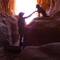 Kurz nach Mittag kommen wir am „Belly of the Dragon“ an. Auf dem Parkplatz unterhalten wir uns mit einem netten Mann aus Idaho und machen uns währenddessen watschelfertig. Unsere Wander-App sagt uns, dass wir hier 3 Kilometer entspannt spazieren gehen können. Für die Strecke packen wir nur leichtes Gepäck, ein paar Bella-Beutel, Sonnenhüte und Kamera. Der Einstieg des Trails ist der „Drachenbauch“, ein Durchbruch im Sandstein, der unter dem wenig befahrenen Highway durchführt. Man versteht auf jeden Fall, warum dieser so heißt; man fühlt sich ein wenig, als würde man durch den Magen eines riesigen Feuermonsters laufen. Als wir in das Licht hinaus treten, finden wir uns in einer mal wieder wüstenähnlichen, bergigen, sandigen Landschaft wieder und watscheln in einem ausgetrockneten Wasserbett drauf los, nach kurzer Zeit stehen wir vor einer Felswand und überlegen, ob der Trail hier schon zu Ende ist. Ein kurzer Blick auf Christians Handy verrät uns, dass wir einen versteckten Trampelpfad nach oben steigen und dann noch „endlos weiter“ laufen könnten. Na hätten wir das vorher gewusst, hätten wir uns ordentlich was zu Trinken mitgenommen und wären eine richtig große Runde gelaufen. Es ist super schön hier, aber wir nehmen uns vor, nach einer viertel Stunde kehrt zu machen, um der Dehydration entgegen zu wirken. Gesagt, getan, sind wir eine Dreiviertelstunde später wieder an Freddie, schnabulieren einen Apfel und ein paar Mandarinchen und machen uns auf den weiteren Weg.