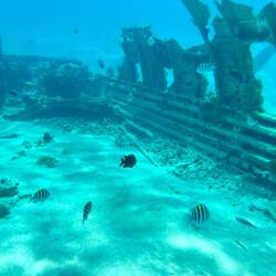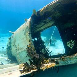 Am Norman‘s Cay liegt auf 4m Tiefe das Wrack des bei einem Übungsflug abgestürzten Drogenfliegers im flachen Wasser des Pelican Creek östlich der Landepiste. Die Kabine der C-46, einer zweimotorigen Transportmaschine aus dem 2. Weltkrieg ist zwar inzwischen zusammengesackt, das Flugzeug aber noch gut erkennbar und DER Schnorchelspot hier.