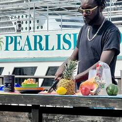 und theatralisch zubereitete Conch-Salad. Der weit verbreiteten Meeresschnecke wird eine „aphrotisierende Wirkung nachesagt“, wendet sich der Confrancier an die Damen.