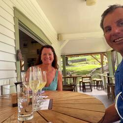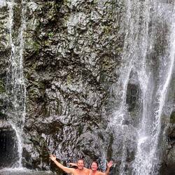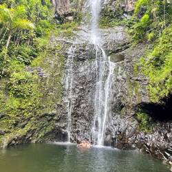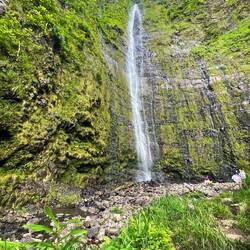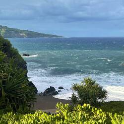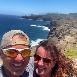 Today started like the others, beautiful weather, Maui grown coffee, and perfect 70 ish weather. Our goal was to drive non-stop 55 miles in 3 hours on the famous Road to Hana. This is a clue to the type road we will be on. My reasoning was to get to our southernmost camp then slowly work our way back for a couple days, stopping at the endless sites along the way. Well, we made it about 25 minutes before our first stop to check out a north shore beach, followed by a stop at Ho’okipa Beach where surfers and turtles frequent. We saw both, with the turtle being more impressive. Now most say a stop at Mama’s Fish house is a must, so we almost stopped, driving through their circle past the valet, and back onto the main road. (It looks like Moma has gotten a little too fancy for her apron) Up the mountain we went on the windy (600 curves) road to Hana. When I say amazing or beautiful, these words barely describe the drive. We were in awe by the views. From the high views of the sea and cliffs to the roadside waterfalls, and the bright flowers and tropical plants, the beauty was endless. An hour and half and about 15 miles in, we stopped for a local ice cream at Coconut Glenn’s and to take a break from the white knuckle driving. Just for a visual, our large campervan takes up almost an entire normal lane, and this road is about a lane and half in most places. Continuing on and noting many pull offs for the way back, we arrived at Kīpahulu In Haleakalā National park. Backing into our site, we were astounded by the beauty. Our view was a blue water rocky coast that was incredible. There were several places in this area we wanted to see so we started a 4.5 mile hike on Pipiwai trail later in the day so we could explore other areas tomorrow. This hike was amazing and took us high over Ohe’o Gulch, passed Seven Pools (pools of water in the river), past a huge Banyon tree, through a bamboo forest, across 2 bridges over the river, and finally to a 400 foot waterfall (named either Makahiku or Waimoku Falls). All together this was one of the most beautiful shorter hikes I have ever been on. And Annemarie didn’t fall down one time. Back at camp, she cooked up and wonderful dinner and we sipped(drank a lot) of wine enjoying our million dollar view.En savoir plus