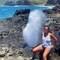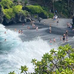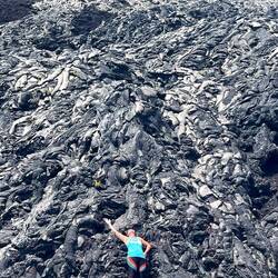 The roof of our van also is a rooftop deck. What better place to enjoy our morning Java, but the upper deck. Fueled up, off we went to our first waterfall of the day for a quick dip, and off to the Hana Lava tube for our self guided tour. A lava tube is just how it sounds, a tube formed where the moltin lava flows forming an outer shell. Once the lava flows out, you are left with a tube. It was more fun making our way down this pitch black tunnel alone. Luckily our flashlight batteries lasted and we made it out. Down the road we found a state park with a railing blocking the river and waterfall. Interestingly no one was on the right side, meaning people were in the water and jumping from the rocks. I don’t have the name but we will definitely remember this as The Falls Steve Leaped, well hesitantly jumped, into. Counting myself lucky to survive what looks from the picture to be my first attempt at flight, we headed to our next camp, Wa’anapanapa State Park and found another beautiful camping site. Not wanting to waste time, we headed down to Black Sand Beach. This is a beautiful jet black beach, in a small cove, hidden amongst the jagged lava rock flow terrain. The sign at the beginning of the beach reminded us of a lesson some of us may have first seen on the Brady Bunch. Don’t take rocks or sand home, it’s bad luck! So leave them we did. The surf was rough and there were a lot of people trying to play in the waves, but it looked more like an out of control party as the waves knock them down then rolled them through the sand. Across the beach was a coastal trail running over the lava fields. I was still wearing flip flops as we walked the sharp lava down the coast. What a rough but pretty landscape. Fortunately my flops held until we made it back to camp where we had dinner and called it a night.En savoir plus