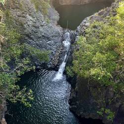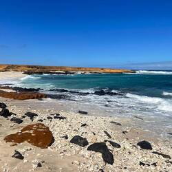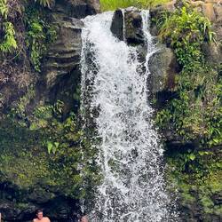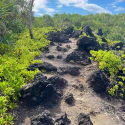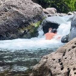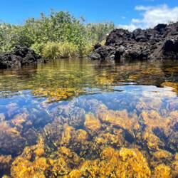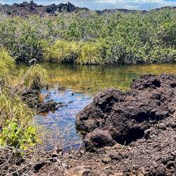 Next up on the agenda, The Golden Pools. Like a lot of our sights, this one is of the “off the beaten path” type. We hiked a across an old lava flow, to a black sand beach which we followed until it turned to a white sand beach, which was really just a lot of coral mixed in, towards some vegetation growing in the middle of the lava field indicating water until we found the golden pools. Now the middle of a black rock lava field can get hot. But here in the middle of the rock was an oasis of crystal clear fresh water cold to the touch. Of course we had to take a break and swim in the cold water. It was a sight to see as we gingerly stepped on the lava rock trying to enter the water. These hard to get to places are some of the best to find and we were not disappointed.