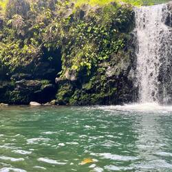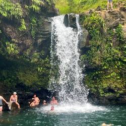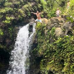 Today included several more stops on our route so I will continue with a more structured approach for the sake of blog length. We stopped at a goat farm where they make cheese and anything else you can think of including fudge. After a few goat pics we were off to Umauma Falls. This was an impressive 3 drop falls located on private land where you can also zip line, 4 wheel, and horseback ride. We just opted for the self guided walk, and again could not get to the bottom of the falls. At the main office there was also a cafe where I was able to try a Hawaiian delicacy, rice topped with spam and wrapped in seaweed. Yum!! Back in the van we saw there was a cave along our route according to our map. Once in the area we had trouble finding it, until we made a second pass where we thought it could be and Annemarie says there, pointing to a hole in the mountain on the side of the road. Adventure seekers we are, we quickly parked, grabbed our flashlights and entered what was really just an opening in the rock. . Now I could say we fearlessly wondered for hours exploring the cave but really we never went further then the light shone from the entrance, even though we had enough flashlights to last a week in there. Once we saw the multiple directions you could take we decided we didn’t want our vacation involving a cave rescue so we left to continue our journey.