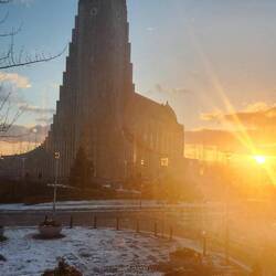 Having breakfast with the amazing daybreak panorama of the Lutheran church