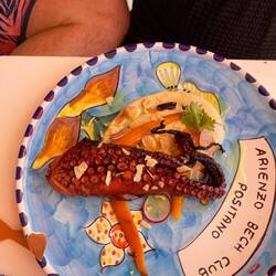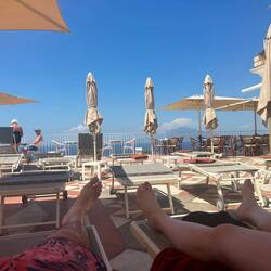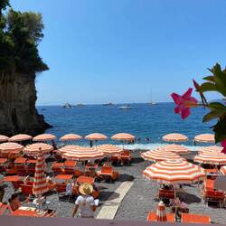 Today ended up largely organized around a beach club. I mentioned one of these a few days ago when we had dinner, but they are essentially clubs where you pay for access to the beach, and they give you chairs, umbrellas, towels, and have a restaurant and staff on site. We went to Arienzo Beach Club just south of Positano; it’s a little out of the way and pricier, but we were going to do a hike first (which we bailed on; too hot and too long a hike), and it’s an actual beach as opposed to a dock on the water (like where we had dinner). Beautiful little spot, right next to a cliff to offer some shade in the water, which is amazingly clear and refreshing as it’s HOT. Zoom in on some of the pics from today and yesterday and look for the orange and white umbrellas; you can see it from a distance “Where’s Waldo?” style if you look.