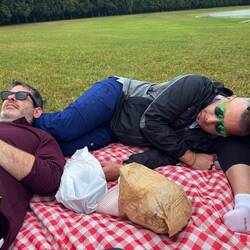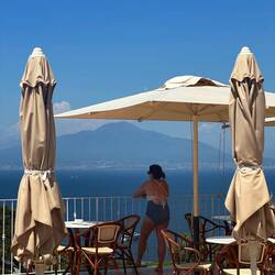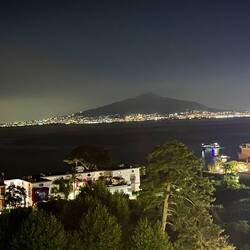 After lunch it was time to relax, which is the big theme of our last stop. We left the tiny but well located Rome apartment behind for a hotel with possibly the best rooftop I’ve ever been on. There’s a pool, patio, and bar that are surprisingly pretty empty. We’re 6 stories up and maybe two blocks from the water, but because the coast is reasonably mountainous we can seemingly see for miles. My phone seems to think we’re 200 to 250 feet above sea level. The Gulf of Napoli opens up before us, Mount Vesuvius off in the distance, and a bunch of towns littered across the coast and the peaks. Midjourney describes the view as “a balcony overlooking the ocean, in the style of monsù desiderio, cinematic view, transavanguardia, hikecore”. Couldn’t have said it better myself. After a quick swim, we discovered the roof is a great place to fall asleep to the sounds of waves, boats, Vespas, and Dave snoring.