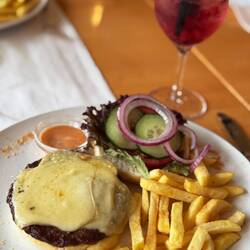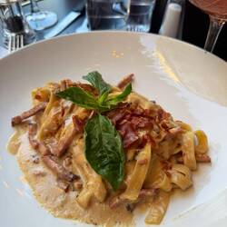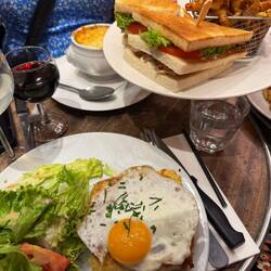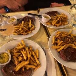 We biked back under clearer skies, changed out of our wet clothes, and leaned hard into dinner. Mike, Dave, and Carrie went classic with steak frites (and some burrata to start), while Mike doubled down on Frenchness with onion soup. Becky, however, swerved straight off the cultural rails and ordered pasta carbonara like it was 2 years ago and she was back in Italy. No regrets.