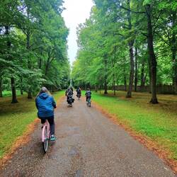We ducked under some trees and continued the lesson on 18th-century opulence and collapse while steadily getting drenched. Eventually, we accepted our soggy fate, mounted the bikes, and pushed on toward the palace.