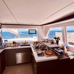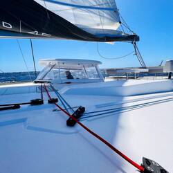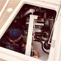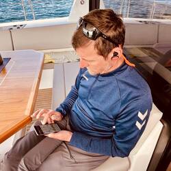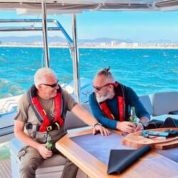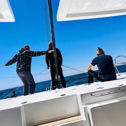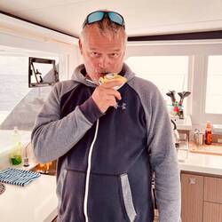 Momentaufnahme, 9:40 Uhr, Handwerker on Bord für die letzten kleinen Veränderungswünsche, Taschen überall, Kram überall, Kisten überall.. ..uhund.. ..die Sonne scheint. Mittlerweile ist es hier 16 Uhr und wir waren eine Kleinigkeit essen, außer Thomas, er hatte sein T-BoneSteak 🤨, und im Supermarkt shoppen. Wir sind alle ziemlich durch, jedoch stehen immer noch diverse volle Taschen rum und es wird weiter verstaut und geräumt. Ich schwitze wie doll und verrückt, hatte das irgendwie mit dem Sommer hier verdrängt weil ich tatsächlich zum segeln auch einen SkiAnzug bei habe, jedoch möchte ich mich keineswegs beschweren. (Hab vom Wetter zu Hause gehört. 😣)